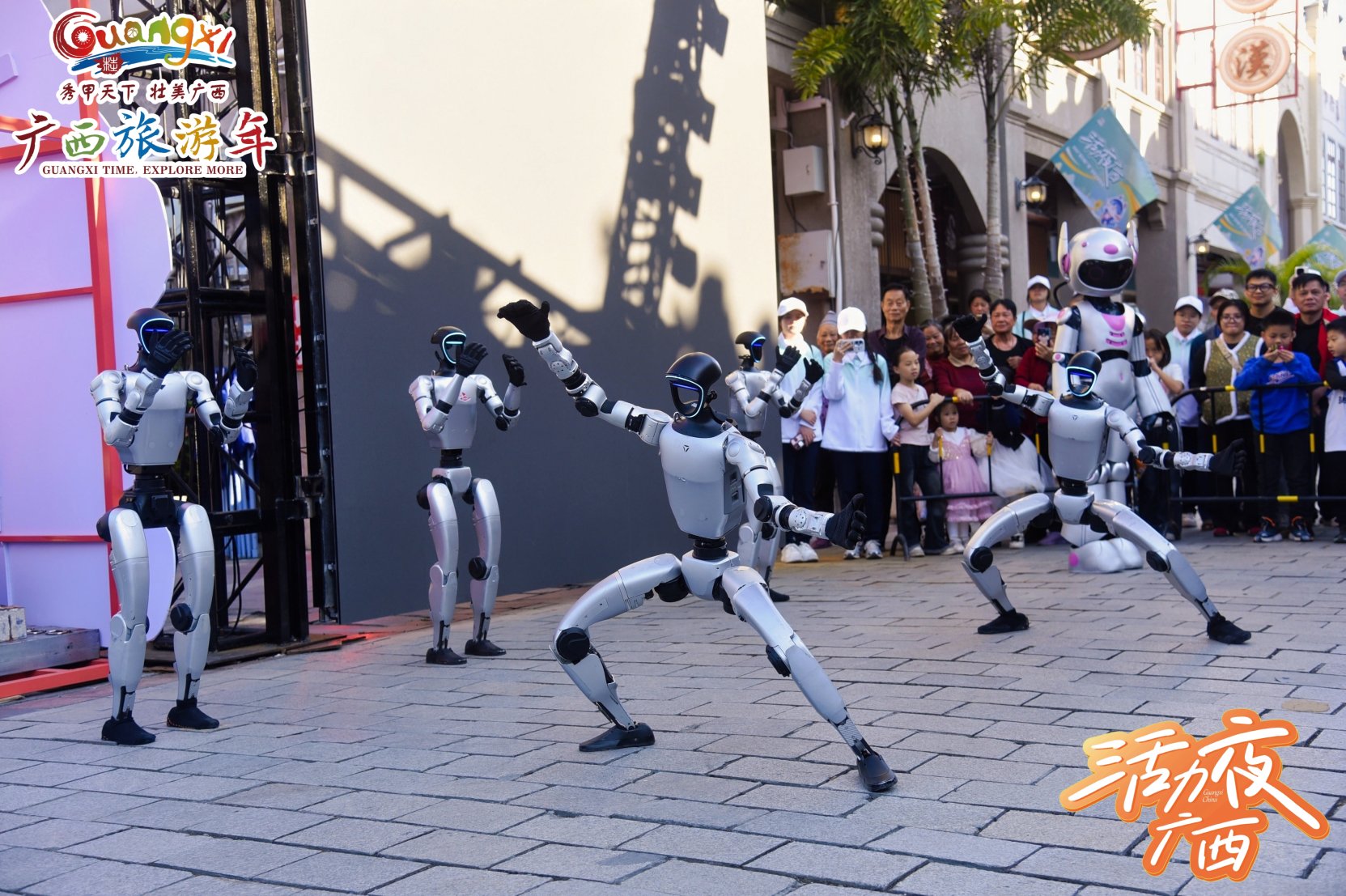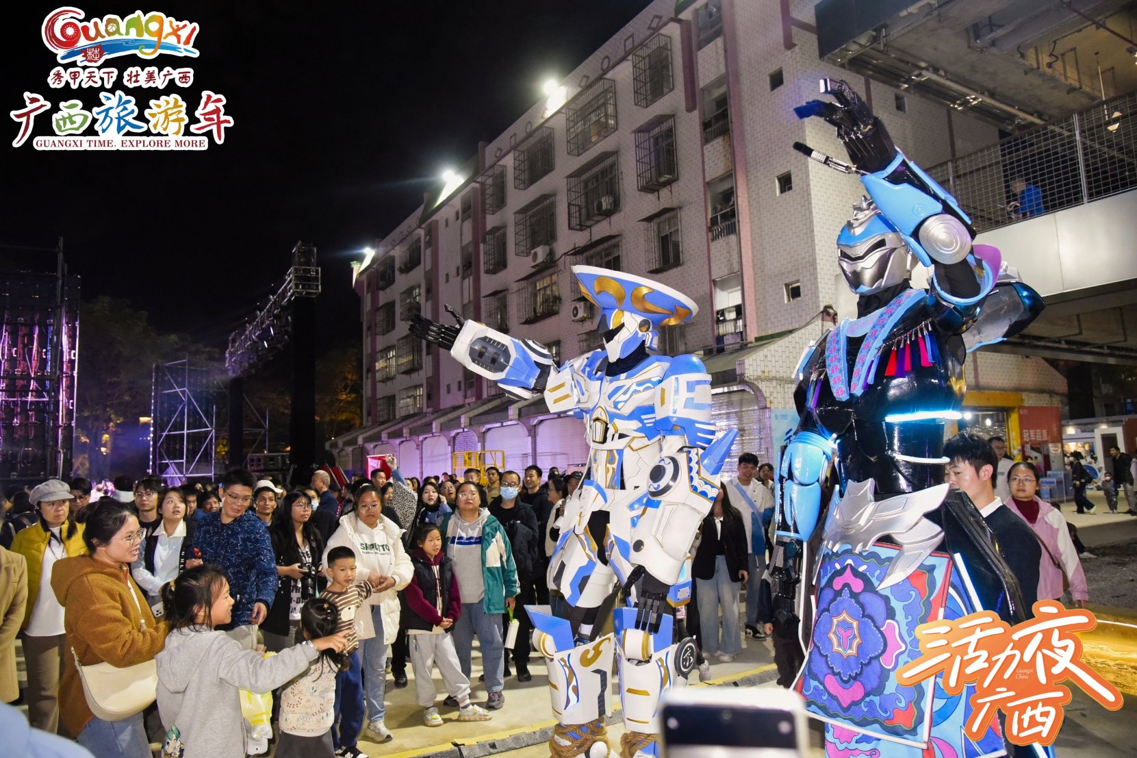 解放街口,“百夜精彩秀”汇聚荧光狮舞、智能机器人、民族机甲和壮族歌舞,用科技表达赋予在地文化新的生命活力,吸引全场目光,瞬间点燃现场气氛,带领市民游客沉浸在难忘的“千姿百色夜”。