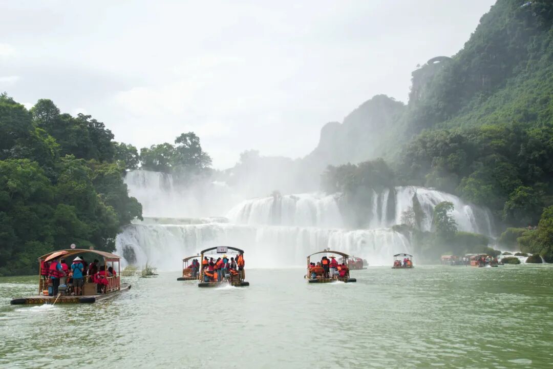 游客在位于广西崇左市大新县的跨境旅游合作区——中越德天(板约)瀑布跨境旅游合作区乘船观光。中新社记者 陈冠言∕摄