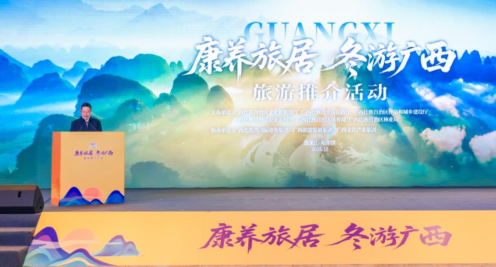 10月28日至29日,由自治区文化和旅游厅联动民政厅、住房城乡建设厅、农业农村厅、体育局、林业局主办的“康养旅居 冬游广西”旅游推介活动在黑龙江省哈尔滨市举办。自治区文化和旅游厅厅长欧余军出席推介活动并致辞。桂黑两地文化和旅游行政管理部门负责人、相关主办单位负责人、旅游协会代表、旅游企业代表及新闻媒体记者等200余人参加本次推介活动。