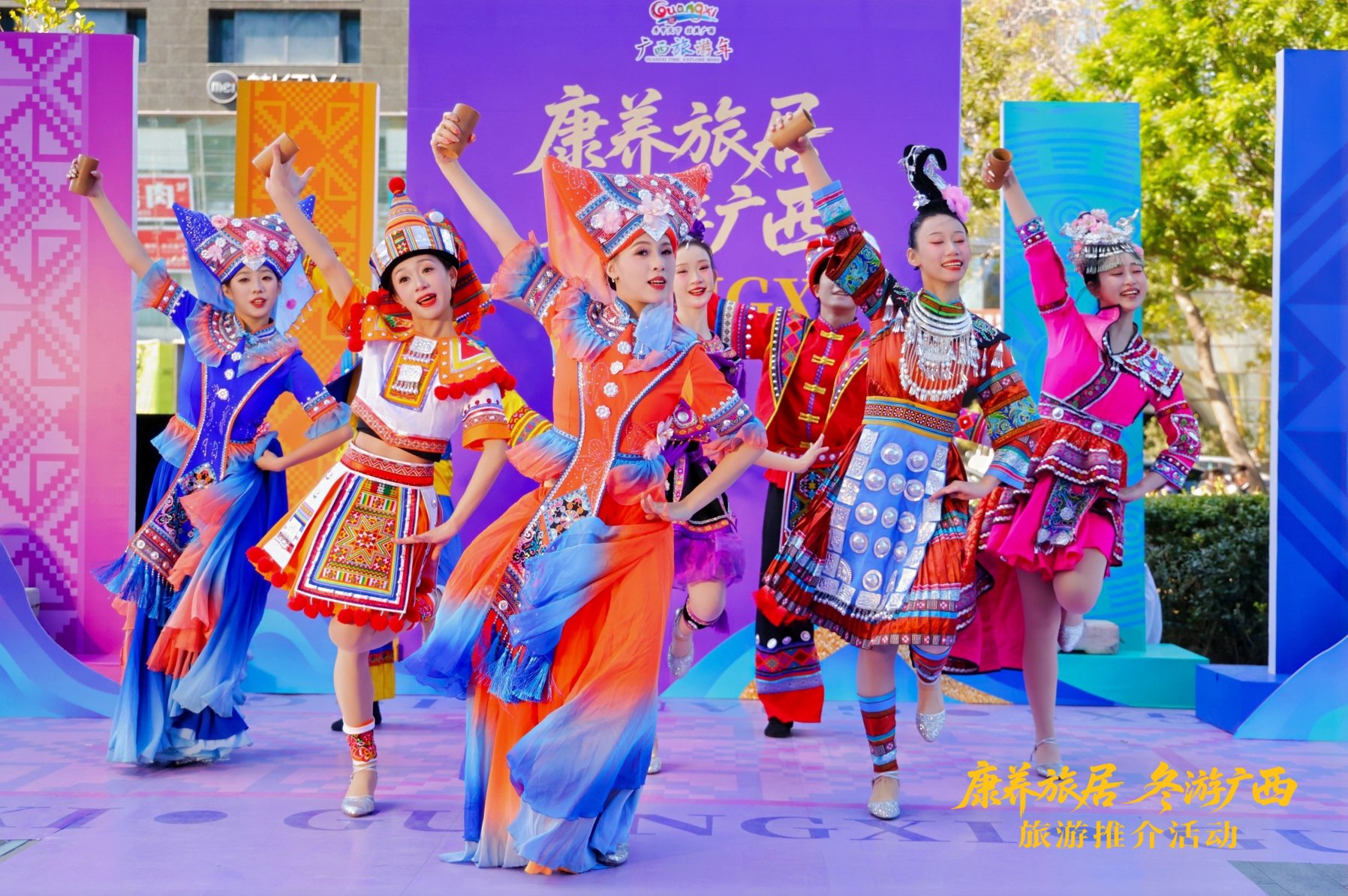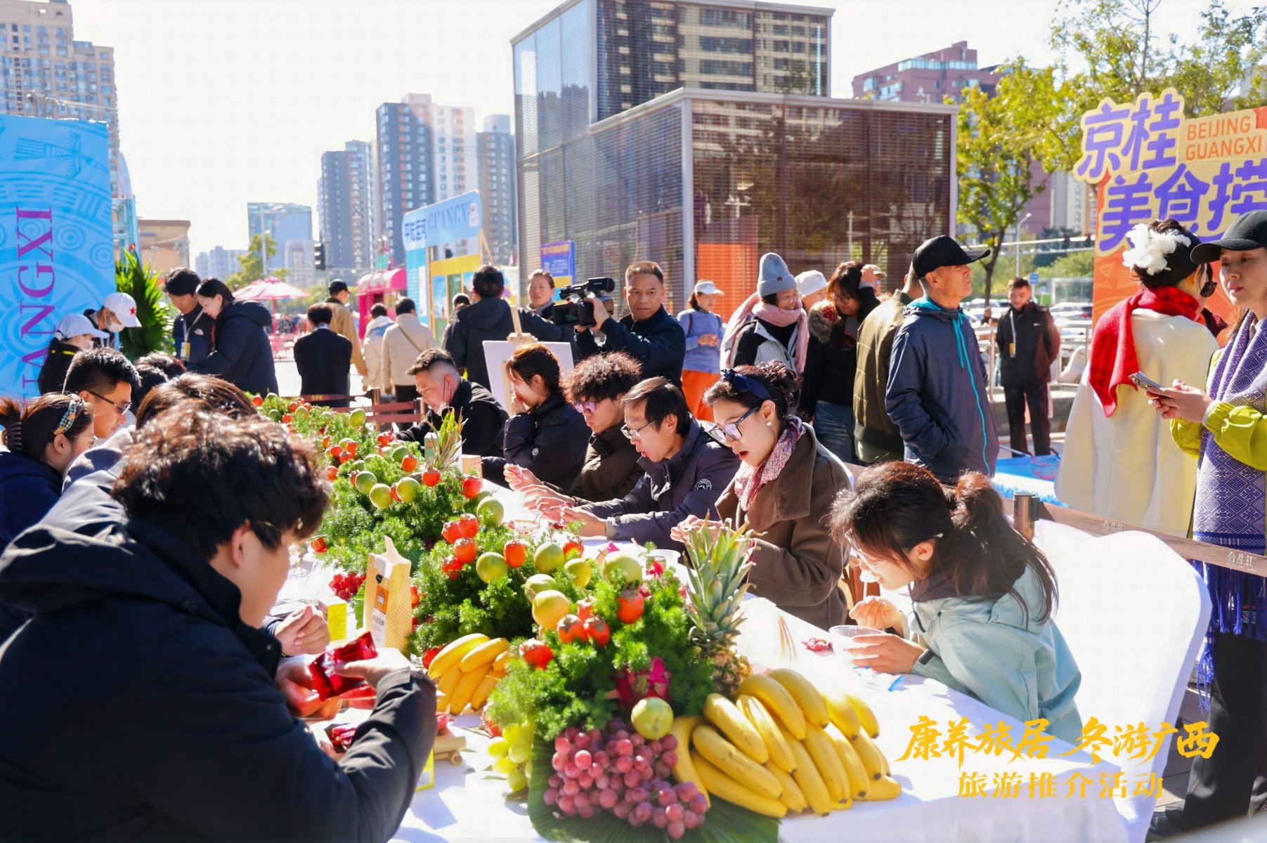 活动期间,“康养旅居 冬游广西”文旅体验活动在北京市朝阳合生汇开展。活动以广西特色长桌宴为核心载体,精心打造“美食+文化”沉浸式体验场景,民族歌舞表演与互动体验轮番上演,集中呈现广西冬季的时令风味与民俗风情。此次活动通过味觉、视觉、听觉的多重体验,让北京市民近距离感受广西“山清水秀生态美,瓜果飘香四季甜”的冬日魅力,吸引众多北京市民前来打卡。