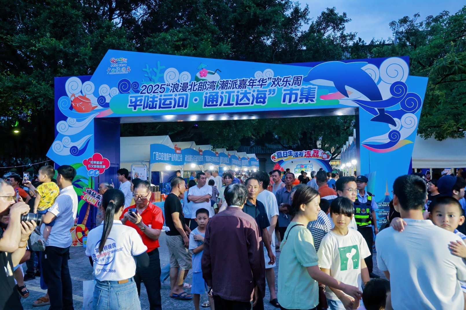 欢乐周的主会场设在具有历史人文特色的永福广场,这里是钦州城市文化的重要展示窗口,欢乐周开幕式、“平陆运河·通江达海”市集、“浪潮之夜”夏日音乐会等系列活动如期在这里举行。值得一提的是,“平陆运河·通江达海”市集汇聚“桂果蜜语”农文旅融合区、“山海馈赠”养生药膳美食区、“桂游万象”广西全域旅游区、“深蓝视界”智慧文旅体验区及“驭浪无界”海上运动装备区五大主题展区,通过大型水果屋装置、特色展销、非遗体验、达人直播等形式,生动展示北部湾特色物产与文旅融合成果。