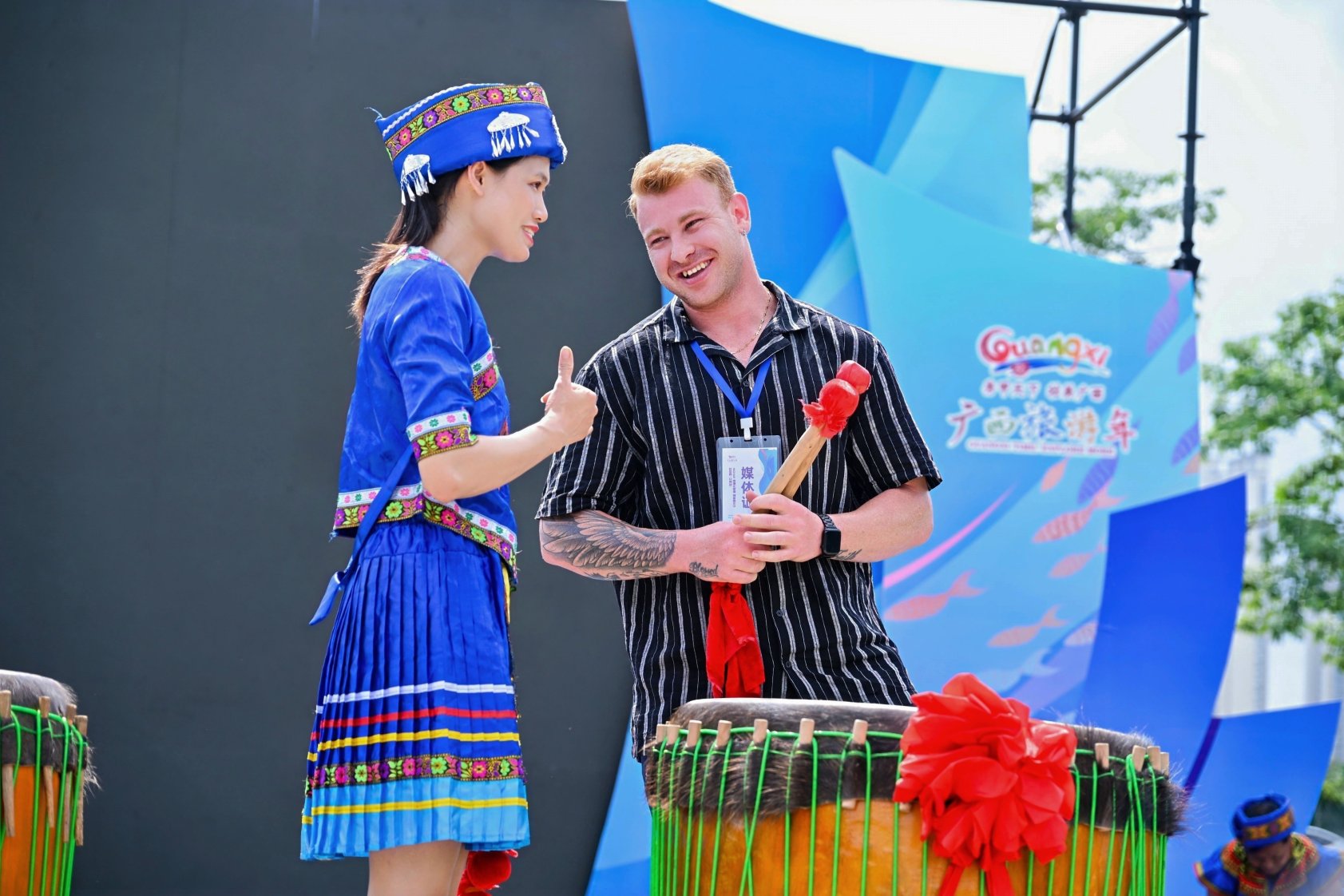 外国友人在当地传承人的指导下体验烟墩大鼓