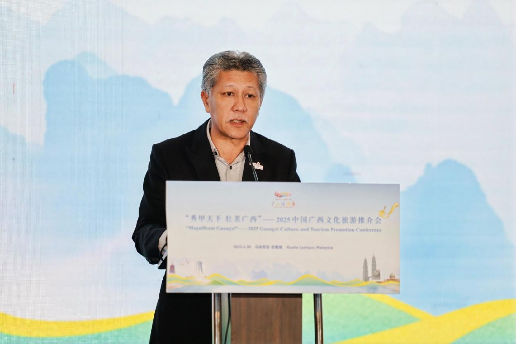 拿督沙哈鲁丁·阿布索霍特在致辞中表示,中马两国长期保持着稳固的外交与经济关系,近年来在文化、旅游和媒体领域的合作蓬勃发展。此次推介会不仅彰显广西的魅力,更重申了我们共同致力于搭建理解与机遇之桥的承诺。马来西亚全力支持“2025广西旅游年”,相信在持续协作与善意的基础上,我们必将深化文化纽带,巩固两国人民历久弥坚的友谊。