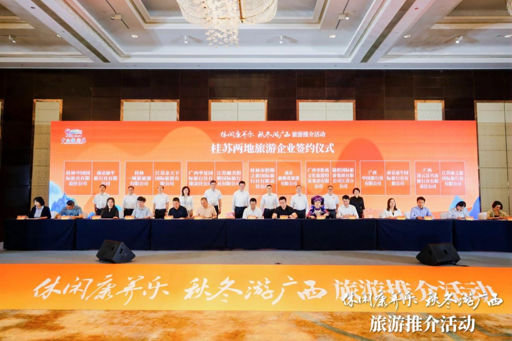 此次推介活动吸引了100多家桂苏两地旅游企业进行深度交流,并开展桂苏两地文旅企业产品对接会,达成多项合作。活动现场,桂林中国国际旅行社有限责任公司、桂林一城游旅游有限公司、广西华夏国际旅行社有限责任公司、桂林市假期之旅国际旅行社有限责任公司、广西零距离文化旅游投资集团有限公司、广西中国旅行社有限公司、广西凌云县兴凌旅行社有限责任公司等7家广西旅游企业,与多家江苏旅游企业成功签约。未来,双方将依托“客源互送、线路共推、政策互惠”机制,为跨省游注入新动能,推动从“资源共享”向“市场共建”升级,为江苏省及长三角地区游客提供更加多样化的秋冬季旅游选择。