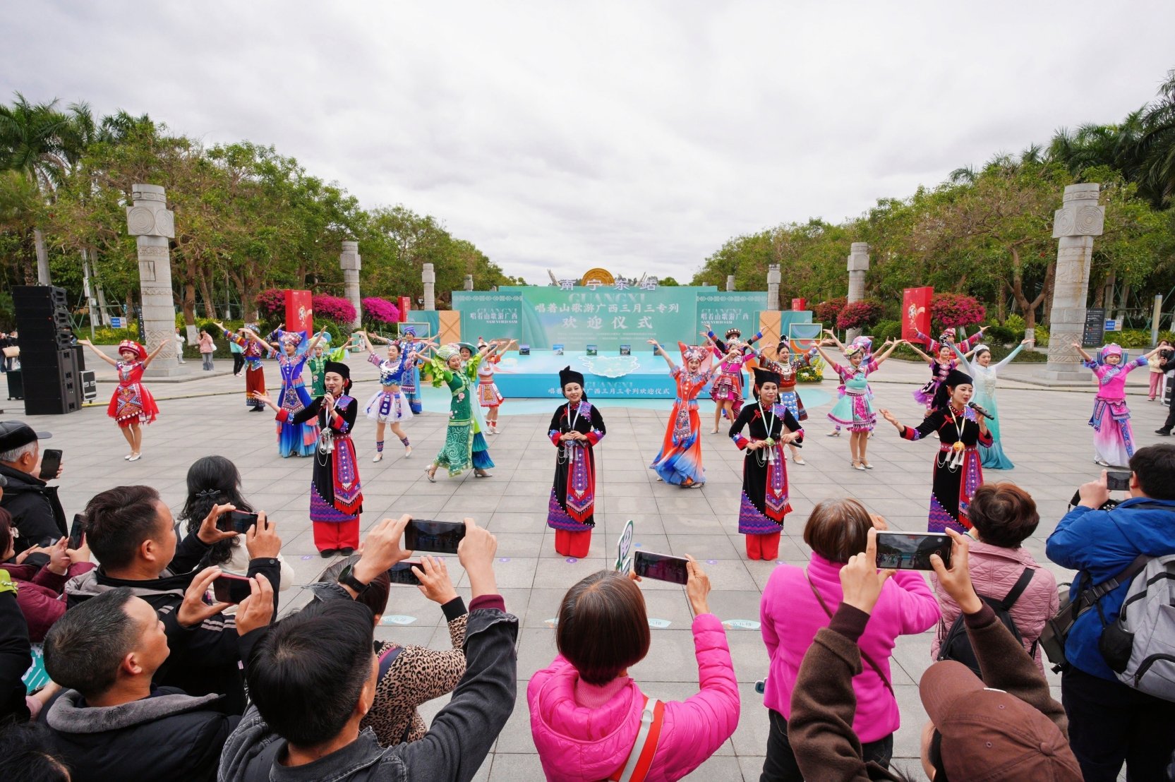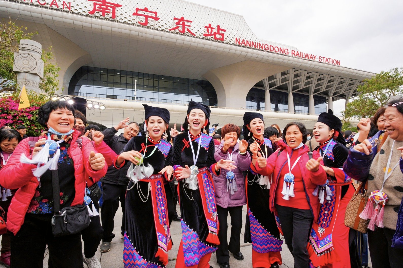 热情欢快的广西特色歌舞喜迎来客、精美鲜艳的壮族绣球礼赠亲朋。“唱着山歌游广西三月三专列”抵达南宁后,广西人民以热情精彩的欢迎仪式向游客朋友们表达了最真诚、热烈的欢迎和祝福。文化和旅游部副部长饶权、自治区副主席胡帆、国铁集团客运部副主任朱文忠等领导共同出席了在南宁东站举行的欢迎仪式,向游客赠送了包括广西旅游导览图、旅游优惠券、三月三特色文创等在内的“广西旅游大礼包”,并与游客和导游代表共同拼出“唱着山歌游广西”旅游地图,欢送游客开启“广西三月三”的幸福旅程。