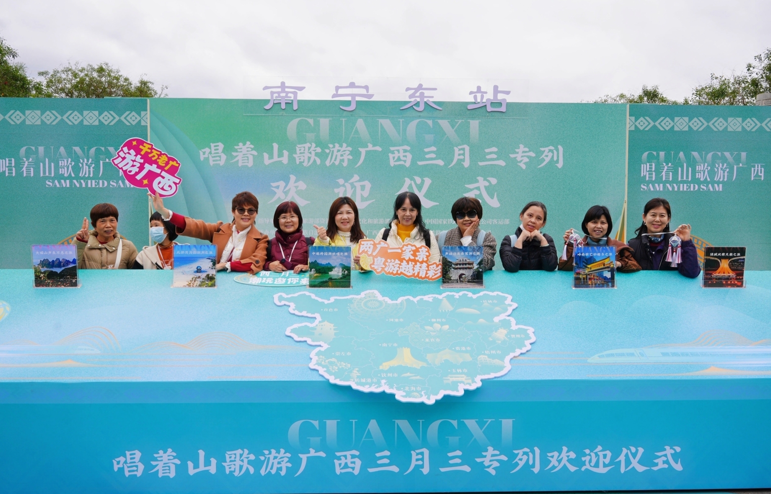 3月30日上午,从粤港澳大湾区和西南地区驶来的2025年首发“唱着山歌游广西三月三专列”分别停靠在南宁东站和南宁站,1000多名专列游客将在广西开启一段精彩纷呈的“三月三”特色文化之旅。
