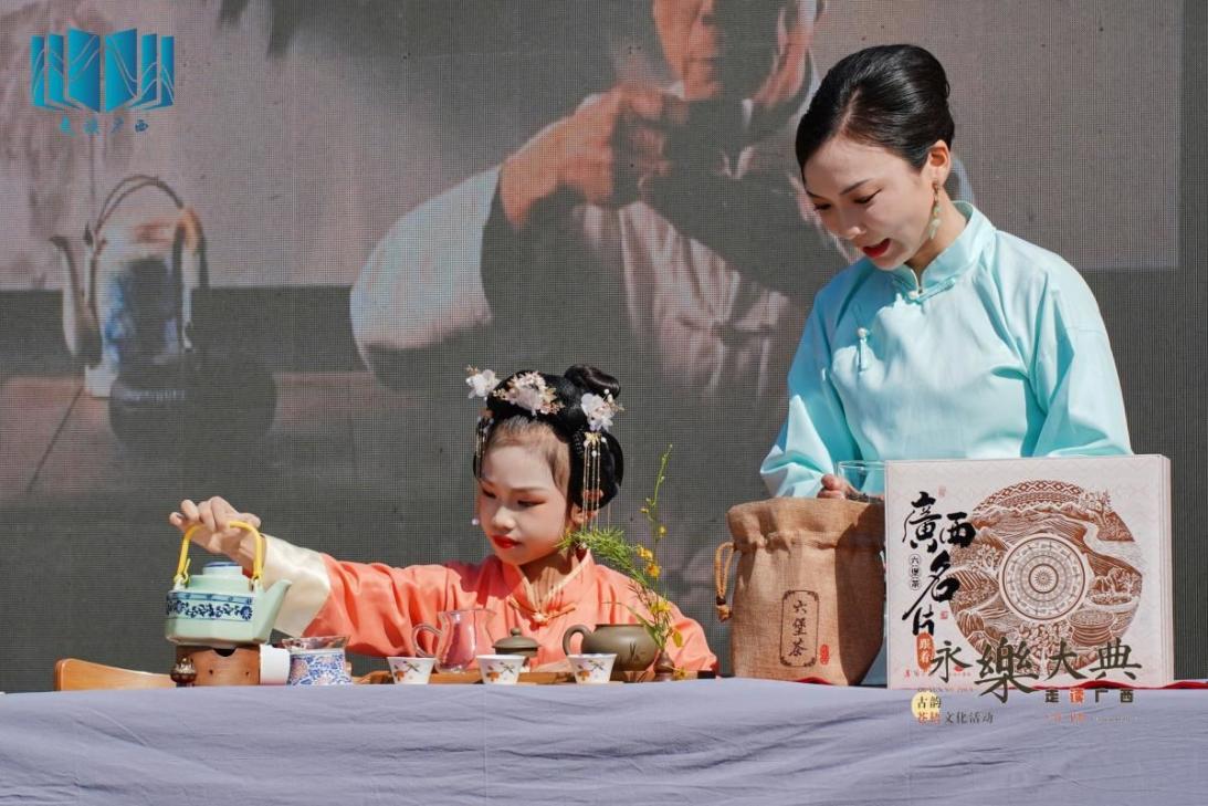 文化分享会邀请了梧州本地文化名人作分享,带领读者进一步了解《永乐大典》与梧州的历史渊源。梧州市图书馆馆长傅家宝和梧州市历史文化研究会副会长彭志创分享了“梧悦永乐·经典归藏”《永乐大典》卷2340—2342(梧字册)、卷2343—2344(梧字册)高仿复制品在梧州市图书馆展览的情况,畅聊《永乐大典》中有关梧州的文化趣事。一级演员、广西戏剧家协会会员元军分享了自治区级非物质文化遗产代表性项目梧州粤剧的历史渊源、发展历程、艺术特点及表演风格,并现场表演了粤剧经典剧目。自治区级非物质文化遗产六堡茶传统技艺制作传承人陈伯昌讲述了梧州六堡茶的历史渊源和发展历程,梧州市非物质文化遗产保护发展协会执行秘书长周春蓉以及六堡茶传承小茶人潘思羽进行茶艺展示,与现场读者分享茶韵茶香。