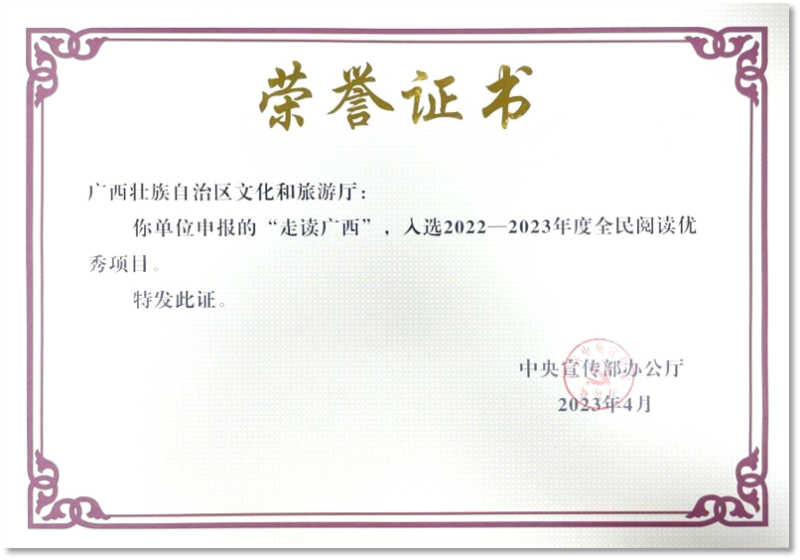 “走读广西”荣获“2022一2023年全民阅读优秀项目”荣誉证书