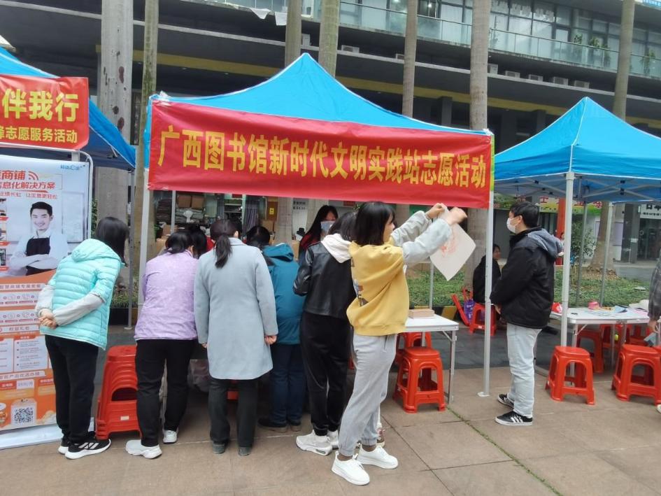此外,广西图书馆还依托资源优势,发挥行业特色,精心设计志愿服务活动载体、内容,通过联建共建开展系列志愿服务活动。3月4日,与民族中段社区新时代文明实践站在阳光100中庭广场联合开展“雷锋精神传千古服务群众心连心”学雷锋志愿服务活动,为市民提供书籍借阅咨询、文化体验互动等服务。3月5日,与广西工人医院联合开展“健康知行书香涵养”学雷锋志愿服务暨联合主题党日活动,在广西图书馆现场义诊、科普养生知识,通过“主题图书推荐+阅读推广活动”“健康科普+义诊服务”,创新将全民阅读与医学科普有机结合,为广大读者和市民朋友送健康、送温暖。
