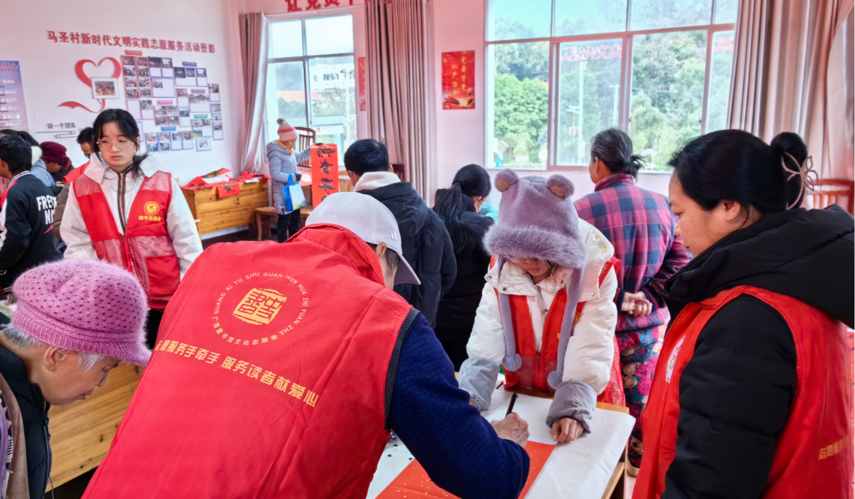 在马圣村,广西图书馆“阿图籽”文化和旅游志愿者与村民委员会联合开展迎春活动,写春联、“福”字斗方、趣味游园活动、《中华人民共和国爱国主义教育法》主题展等互动展示内容引来大批村民热情参与。在古禄村,广西民族博物馆带来的投乒乓球、蒙眼击鼓、投圈送礼、双人运球、有奖答题等游园活动,让村民们玩得不亦乐乎、流连忘返。在白山村,广西群众艺术馆“刘三姐”文化志愿服务队组织开展的迎新趣味游园活动同样是欢乐不断,还有书法文化志愿者现场挥毫泼墨书写春联,为浓浓年味增添了一缕清雅墨香,满足农民群众多样化、多层次的文化需求。