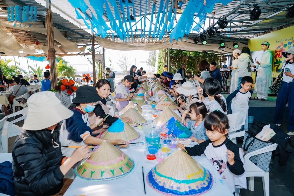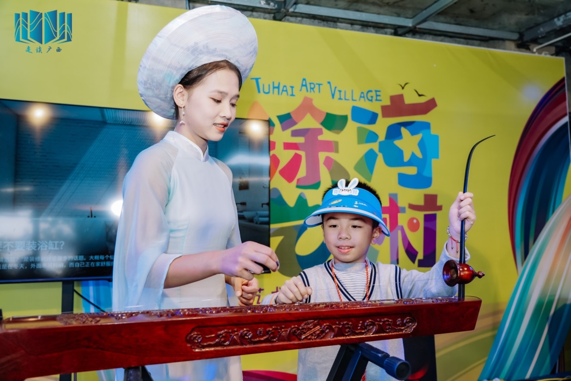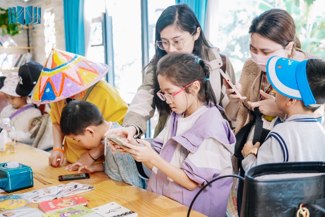 在充满艺术气息的涂山艺术村,读者们短暂地化身为“临时村民”,在村长的引领下欣赏艺术村里风格各异的艺术作品,感受当地自然风光与传统建筑相互映衬凝聚的时光魅力。读者们还参与了广西图书馆的“趣读甲骨文”线上活动,以及画斗笠、串珍珠、独弦琴弹奏等线下体验活动,收获了精美的文创产品,感受文化艺术魅力。