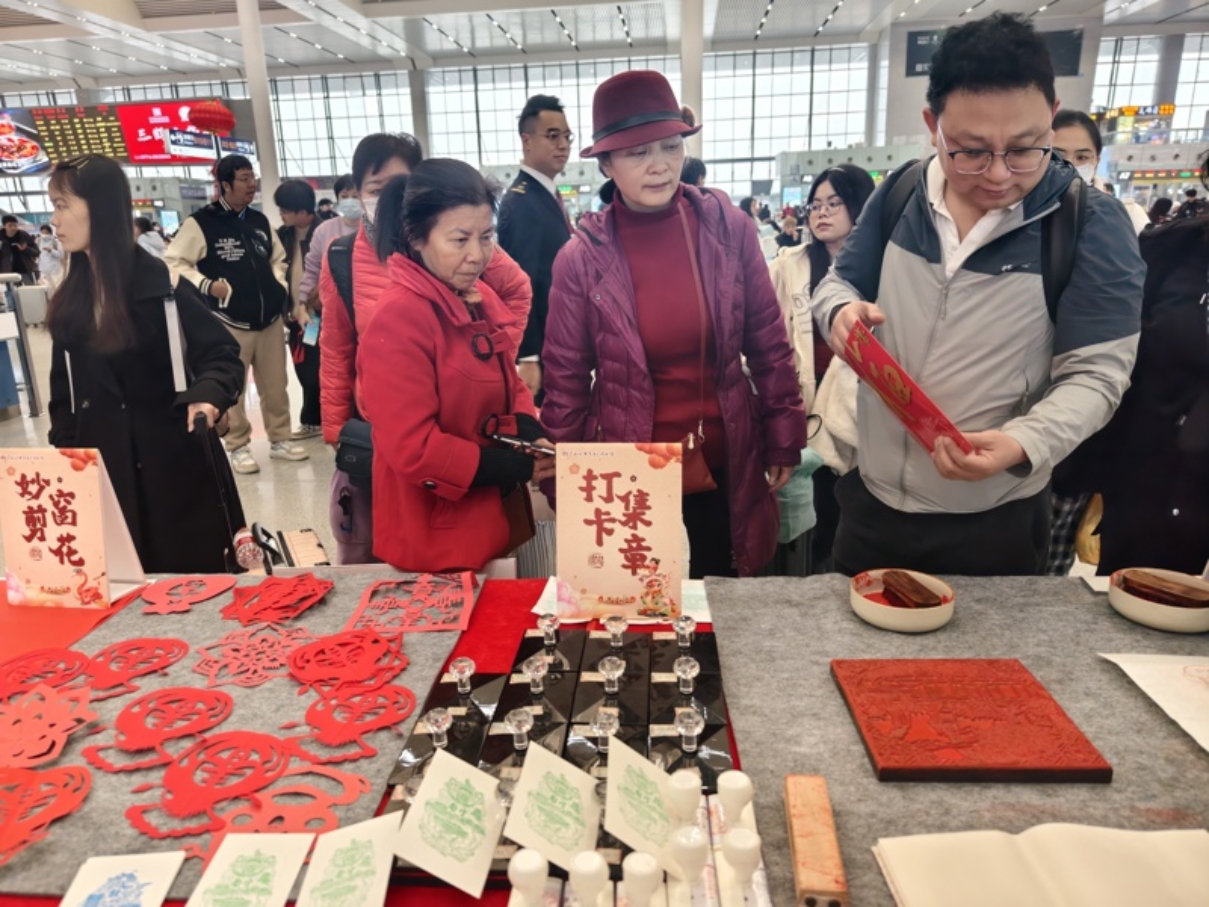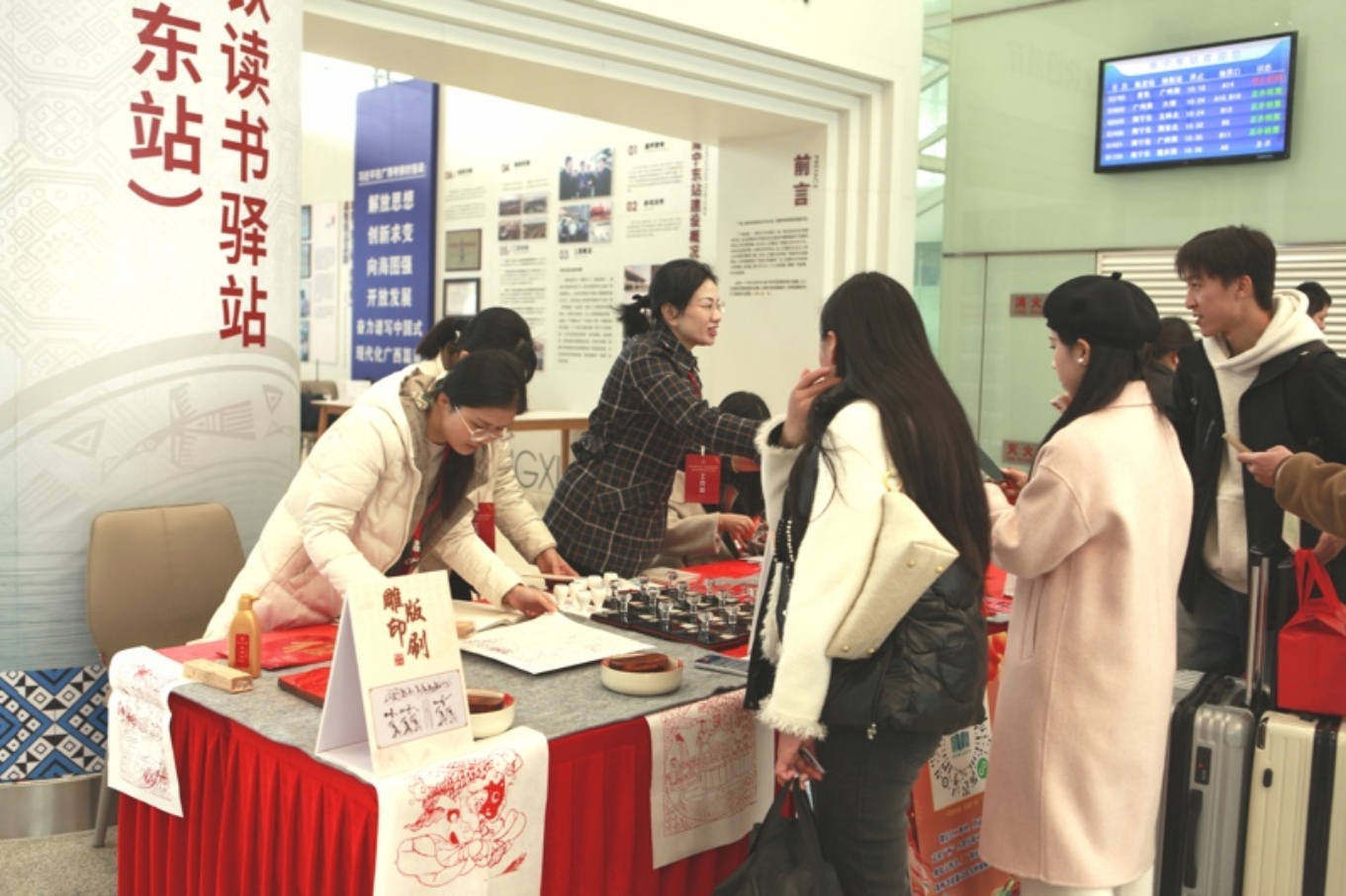 本次活动以阅读、非遗为载体,通过免费办理借书证、雕版印刷技艺体验、剪纸技艺体验、打卡集章,以及“书香铁路 走读广西”小程序宣传推广等活动,为旅客送上新年祝福,为旅途增添书香气息,受到旅客热烈欢迎,吸引3000多名旅客参加活动。