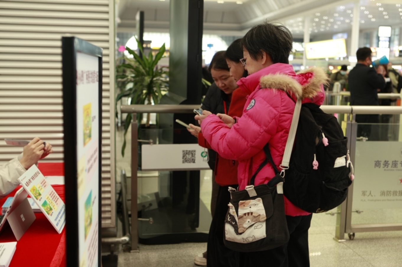 工作人员指导旅客扫码使用“书香铁路 走读广西”小程序