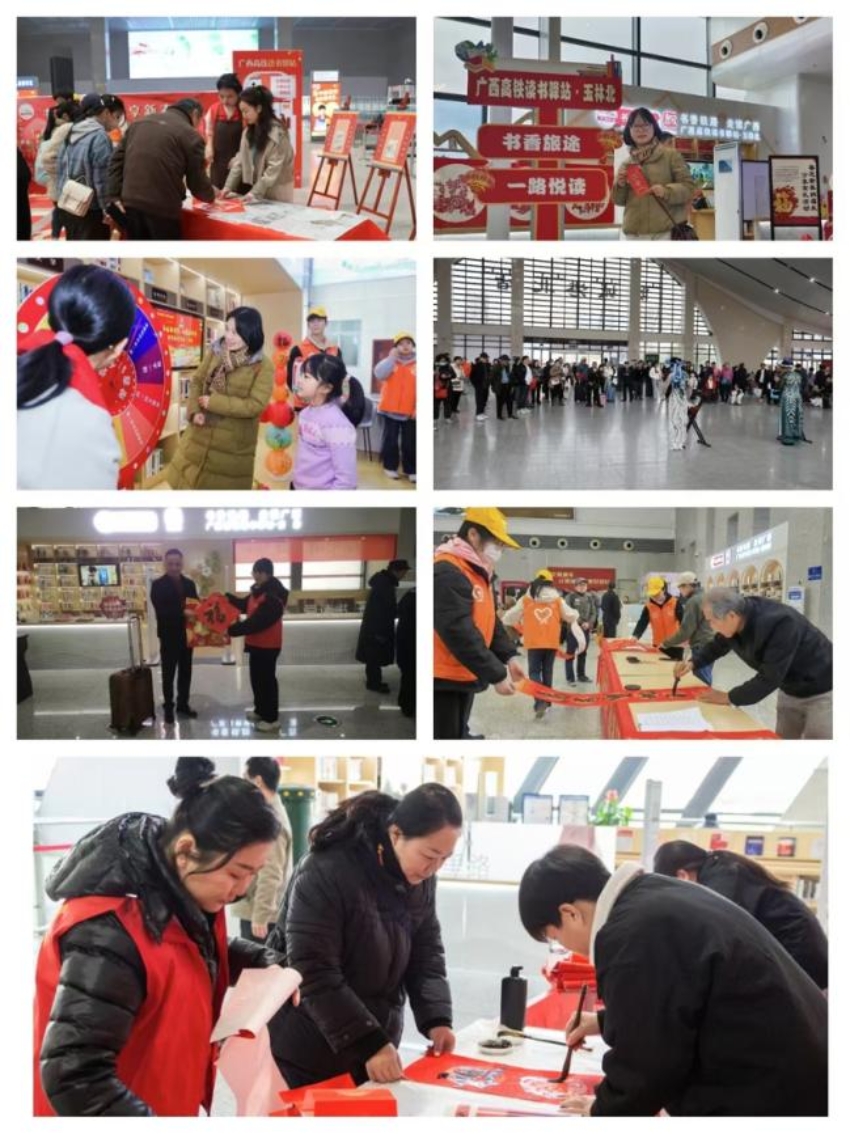 柳州、防城港北、玉林北、梧州南等高铁读书驿站设置主题书展和图书阅读体验区,让旅客在旅途中也能领略到家乡文化的独特魅力;钦州、北海、桂林、河池西等高铁读书驿站则推出了雕版拓印、年俗体验等非遗活动,让旅客亲身体验传统文化的独特韵味;贺州、贵港、百色等高铁读书驿站则巧妙设计了幸运大转盘、民俗文化答题、猜灯谜等互动式趣味活动,为旅客的旅途增添了一份乐趣;崇左南及来宾高铁读书驿站则贴心准备了新春打卡背景、道具、手持牌等供旅客拍照打卡,留下旅途中最美风景。
