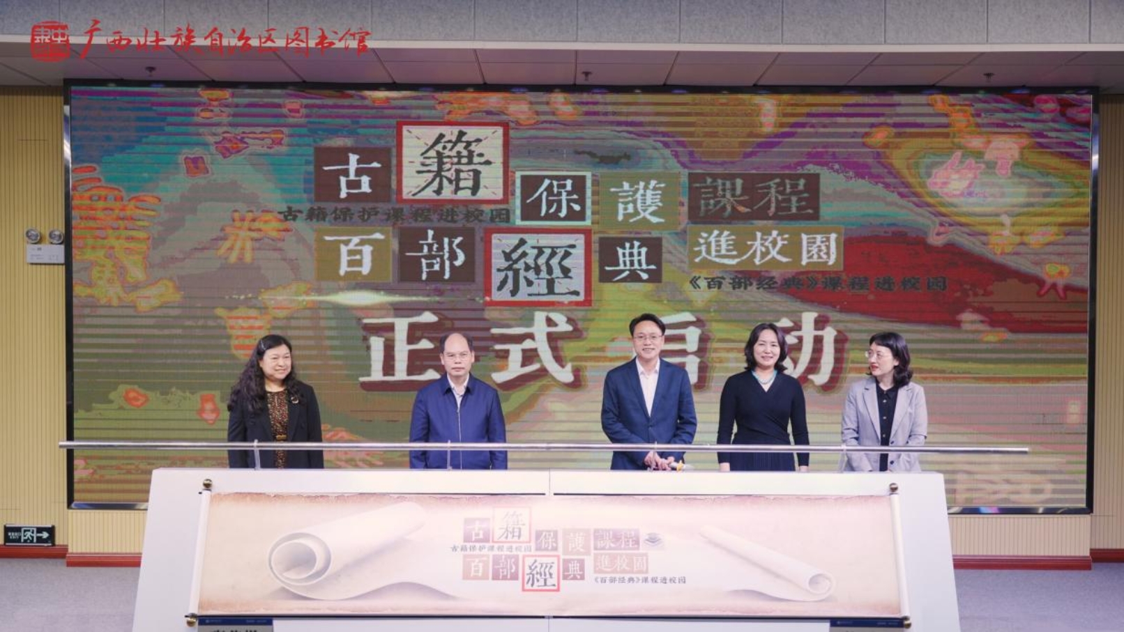 2025年3月28日,由国家图书馆(国家古籍保护中心)、广西壮族自治区文化和旅游厅联合主办,广西壮族自治区图书馆、广西民族大学文学院、广西民族大学图书馆共同承办的“古籍保护课程和《百部经典》课程进校园”系列活动启动仪式在广西民族大学相思湖校区举行。十四届全国人大民族委员会委员、中国东方文化研究会会长、国家图书馆原馆长熊远明,国家古籍保护中心办公室主任王红蕾,广西壮族自治区文化和旅游厅党组成员、副厅长班华勤,广西民族大学副校长黄晓娟、广西壮族自治区图书馆馆长秦小燕等领导嘉宾出席启动仪式。