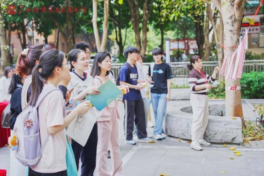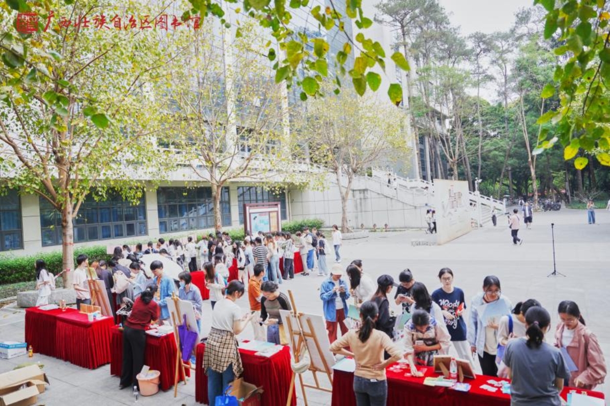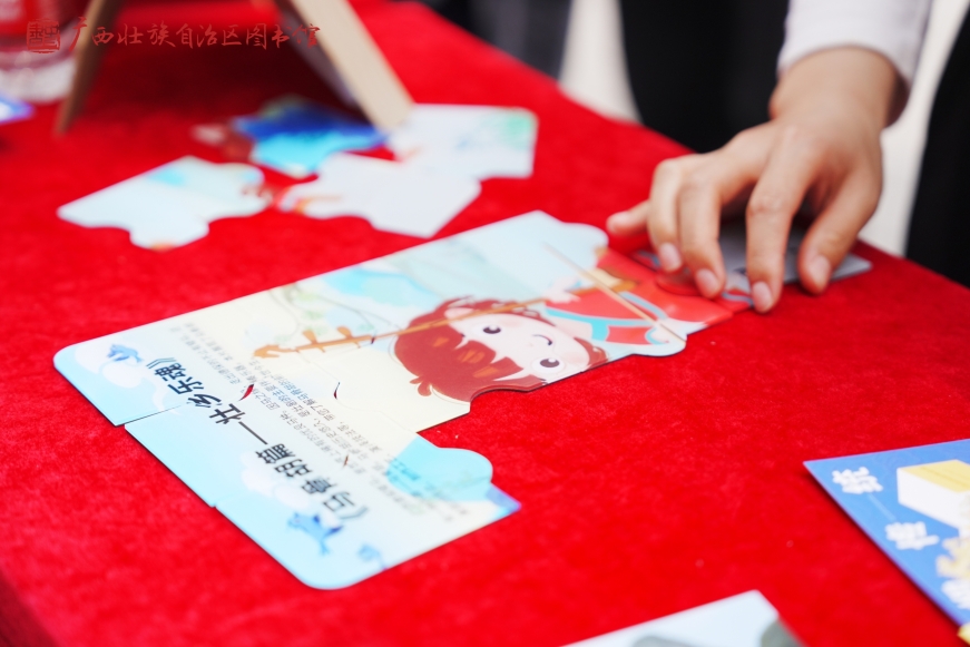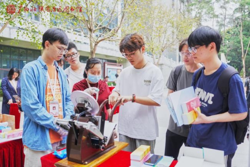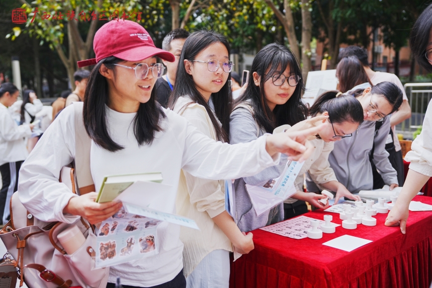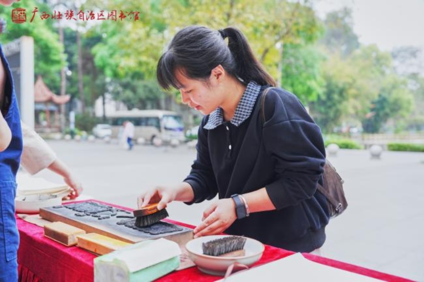 广西壮族自治区图书馆带来了“三月三对山歌”雕版印刷、“四时读书乐·春”凸版印刷、“说文解字 书海谜踪”《百部经典》猜谜、“甲骨启智·寻迹广西地名”、“甲骨文十二生肖”趣味集章等传统文化体验活动,带领师生们体验传统技艺之美。当“壮族三月三对山歌”纹样在宣纸上随着雕版印刷呈现,甲骨文地名谜题被逐一破解,现场响起了此起彼伏的惊叹声与欢笑声,生动诠释着“让书写在古籍里的文字活起来”的深刻内涵。
