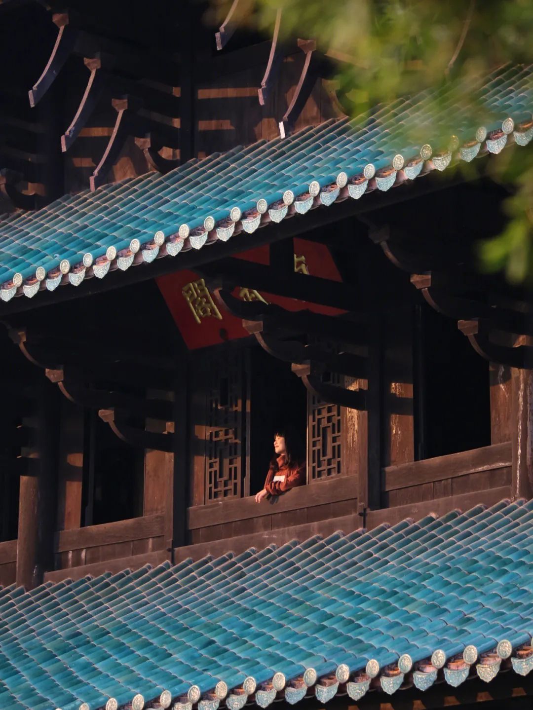 再上三楼,凭窗凝神眺望。习习江风迎面吹来,窗外古木成荫,层层绿意沁人心脾。