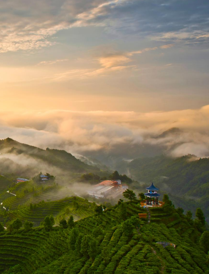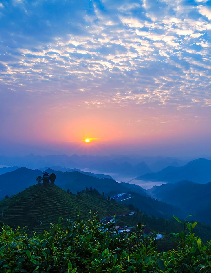 正午的阳光穿透迷雾,越过树枝,抵达未知的坑底,让这里变成了神秘的光影森林。斑驳的岩壁,仿佛在无声地诉说着这些天坑背后的故事。凌云茶山吸引人,不止是因为独特的“金字塔”,更是因为源远流长的茶文化。海拔1100米的茶山上,分布着大大小小五十余个茶峰,连绵起伏,形似一座巨大的绿色“金字塔”。再来听一曲原生态的山歌,品一碗凌云茗茶,把自己浸润在满山茶树的清香之中。盛夏的时光不该局限于海边冲浪,穿梭在青翠悠然的茶山里,也能感受到夏的张扬。
