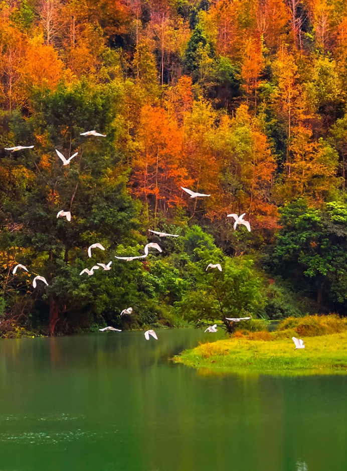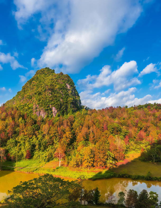 公园内既有红枫,又有湖水和峰丛,每走一步都能看到一幅绝美的秋日画作。似火的枫叶与湛蓝的湖水,相映成趣,令无数人为之倾倒。等到季节再次轮回,让我们走进德保红叶森林公园,再一次和色彩纷呈的秋天相遇。红色,是百色的底色。1929年12月,这里打响了百色起义的第一枪。它傲然地矗立在我国西南边陲,像个战士一样守护着边疆。“我仰望过你看过的天空,脚下大地已换了时空,你留在风中摇曳的那抹红,在心中。”如果不曾见识过历史的波澜壮阔,那就无法感知百色这片大地上的壮丽辉煌。百色起义纪念馆前身为右江革命文物馆,始建于1961年,现坐落在百色市城东区迎龙山上。这里是百色的精神高地,也是人们向往的红色福地,再现了中国共产党在少数民族聚居地区举行百色起义和开辟右江革命根据地的斗争历史。矗立在百色城东后龙山上的百色起义纪念碑,高23.9米,外形似一面迎风飘扬的红旗,又似一杆红缨枪直指天宇。穿过百色闹市一条弧形的骑楼街道,粤东会馆的红墙褐瓦在解放街一片灰白色的建筑群里尤为显得与众不同,有着强烈的南方古建筑风格。会馆布局严谨,主次分明,以前、中、后三大殿宇为主轴,以三进三路九院为布设,两侧是对称的厢房,构成“日”字型建筑群。穿过正门,抬头望去,迎宾厅屋脊上“双龙戏珠”的五彩琉璃的立体浮雕装饰颜色斑驳,却精致不乏神韵。粤东会馆之所以在百色历史上有着至深的印记,是因为它见证了一段至关重要的红色故事一一百色起义。如今,粤东会馆正以缄默的方式还原当年将士们在此度过的日夜。田州古城坐落在壮族传世神布洛陀的故乡——田阳,拥有着千年古城的热闹繁华与小桥流水的恬静诗意,充满了壮族民俗风情。从爱情信物绣球到艺术瑰宝铜鼓,从展示民族崇拜文化的娅王阁到洋溢民俗文化气息的布洛陀广场,田州古城在历史长河中的点点滴滴仿佛就在眼前。当两岸的灯火倒映在河面,晚风吹动心田,水车卷起水花,古城就像是一颗璀璨的明珠,美得如此纯粹。宁静与淳朴的旧州古镇就像是沈从文笔下的“边城”。这个充满民族风情的地方,也是中国绣球之乡和瓦氏夫人的故乡。旧州古镇像一个从旧时光中走来的女子,把自己装扮得亦梦亦幻,蜕变成如诗如画的人间桃源。地处骆越文化和云贵高原文化结合部的百色,自古便是多民族繁衍生息、聚集交融的地方。勤劳智慧的各族儿女在这片神奇的土地上,创造了灿如星辰的多元民族文化。寻访黑衣壮的故乡那坡,听一曲山歌“呢的呀”,走过干栏民居,与古老的文化来一次对谈。黑衣壮是壮族的一个支系,他们被称为壮族的“活化石”。因为这个族群的历史,就像一部记录壮族生活形态的历史书。
