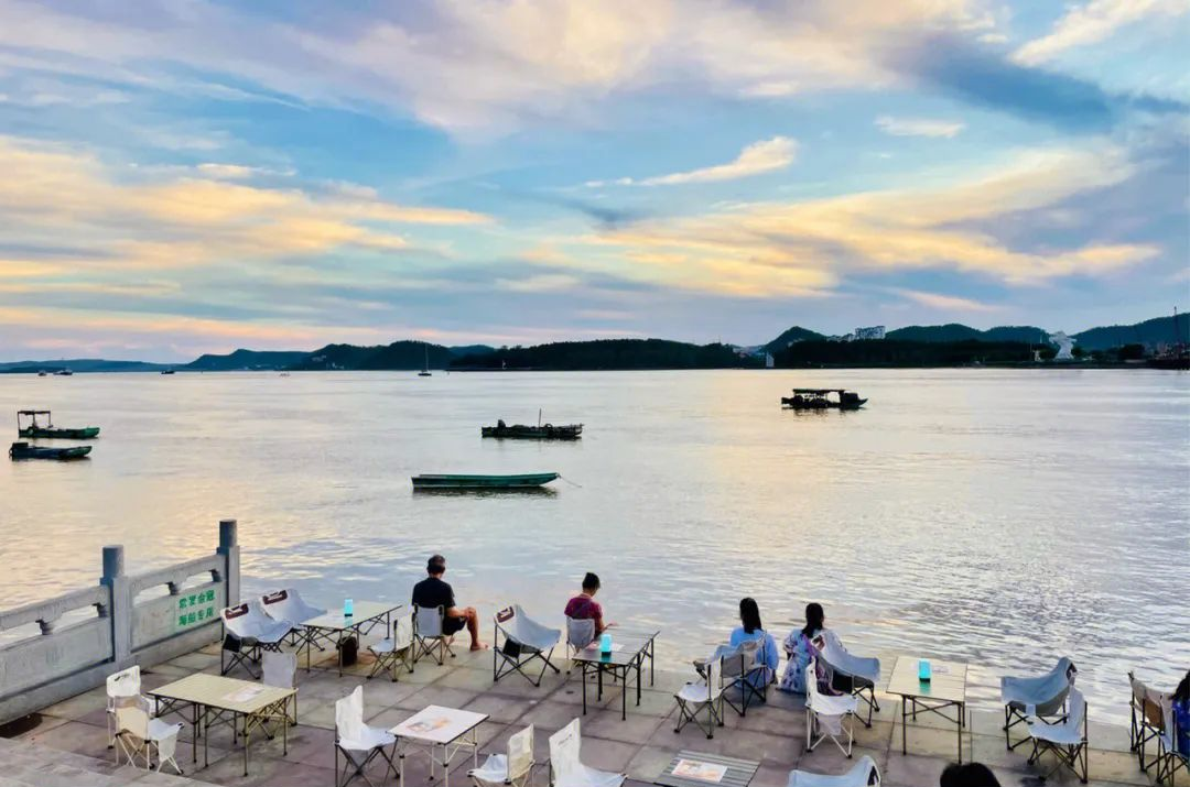 夕阳西下,日落映出橘色的海,渔船归港,三人垂竿向绿川,好似在拍一部浪漫的文艺片。