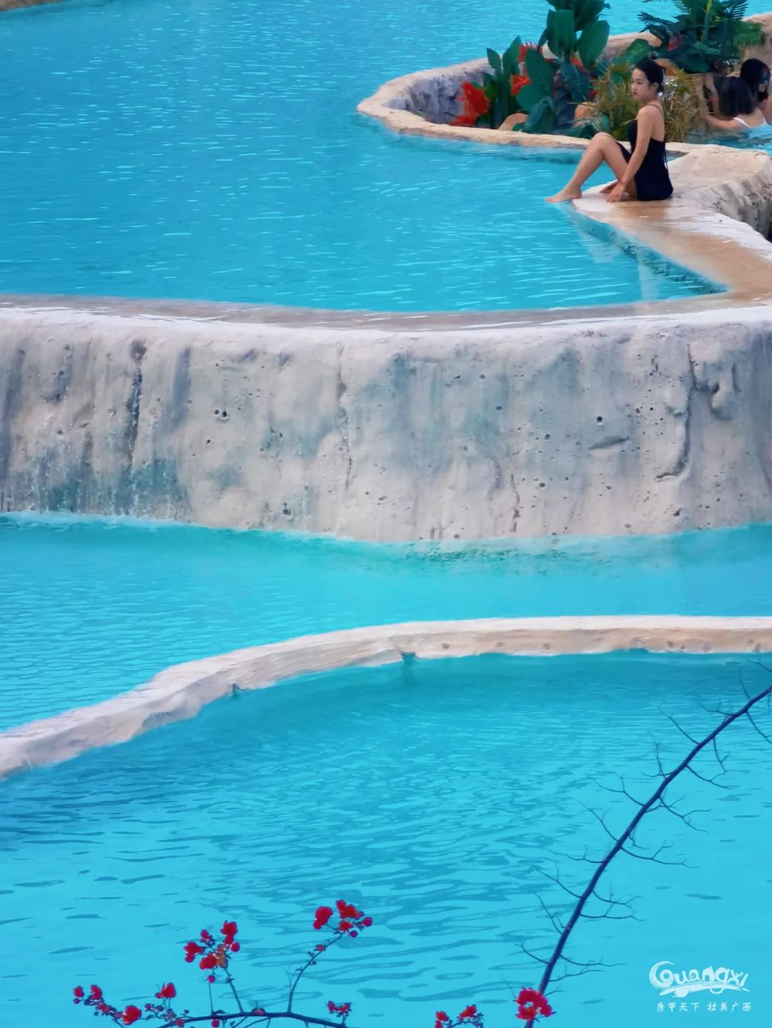 这里的温泉水富含多种矿物质,其水体通透,是国内少见的蓝色温泉,被称为“中国蓝泉”。