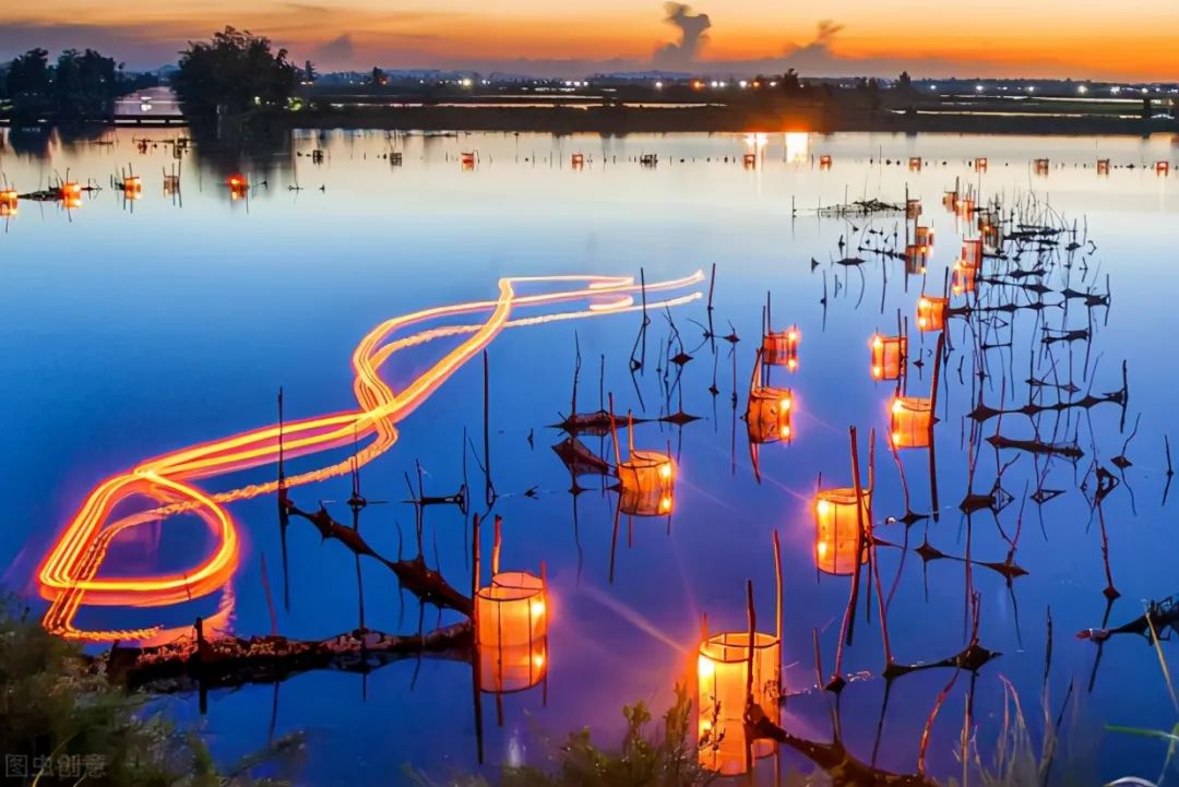 入夜的海面上,渔火星星点点,虾笼一闪一闪,构成一道奇妙的风景。通往万尾的海堤路上,是拍摄京岛虾灯的最佳地点,成片的虾塘浅滩围地成景,错落有致的虾灯如同散落的碎星,无比壮观。