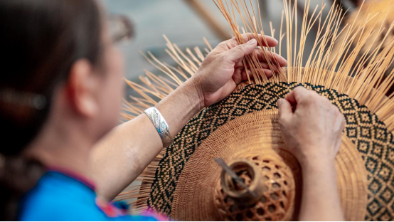 前往国家级非遗代表性项目毛南族花竹帽编织技艺传习示范基地,听国家级非遗代表性传承人谭素娟讲述花竹帽编织技艺。