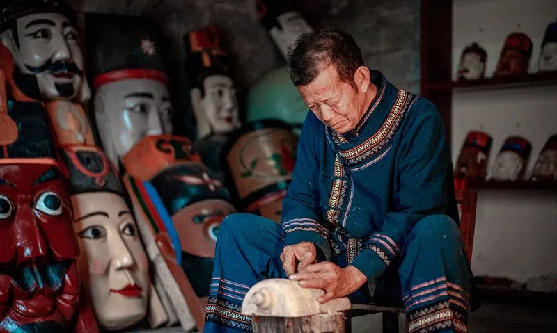 当八方亲朋到访后,戴上傩面的师公,以说、唱、跳、击鼓等形式,进行神秘而隆重的仪式,为男子还愿、感恩、祈福。傩面更是一种很美的艺术品,在它简朴古拙的形态之下,承载的是一个地方、一个民族源远流长的民俗文化,传递的是对自然及生命的崇拜和敬仰。