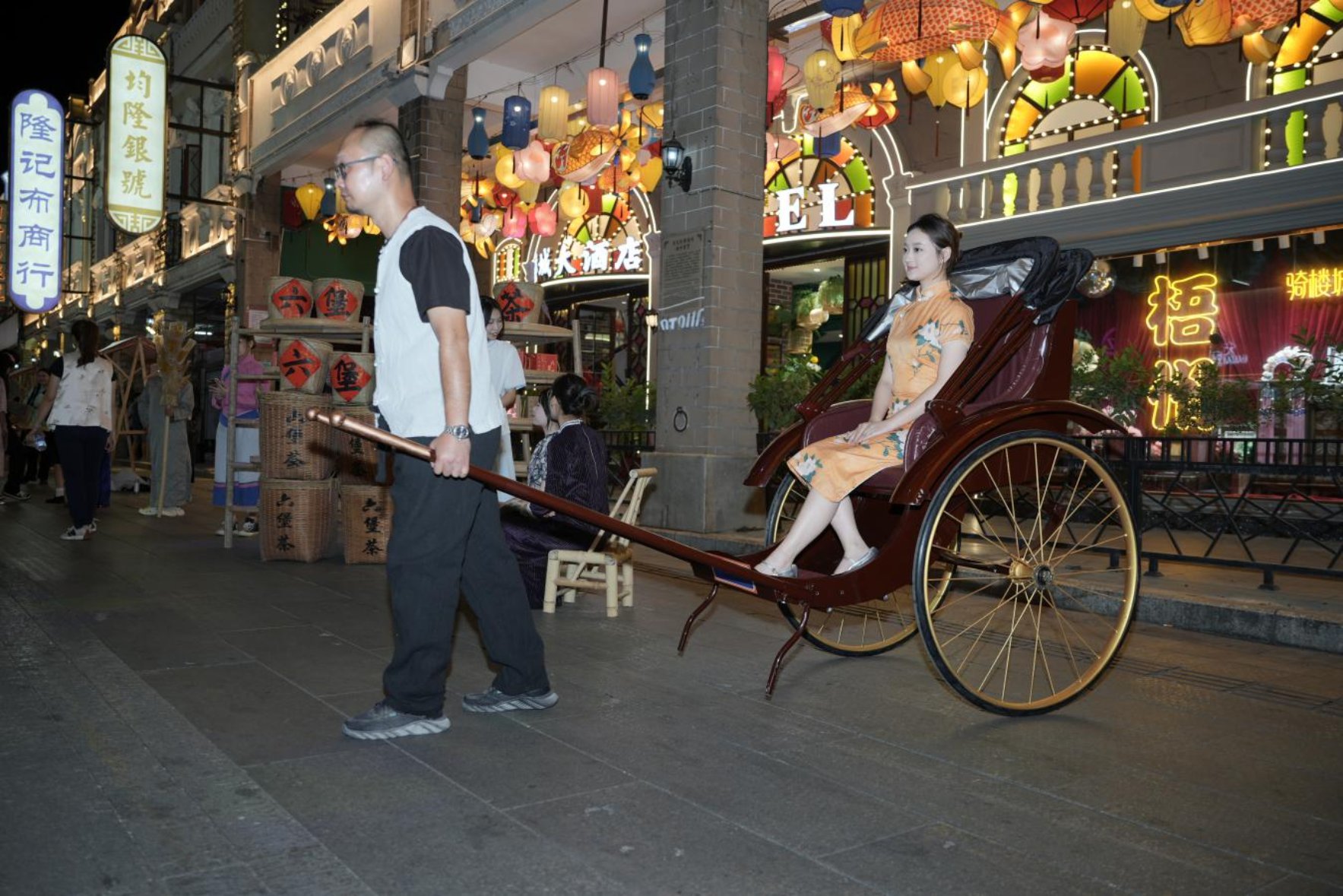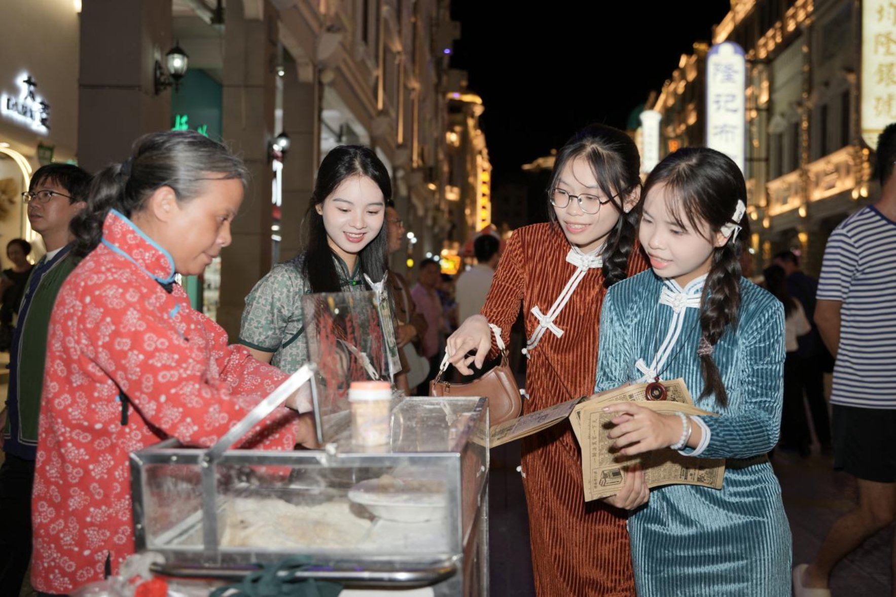 步入骑楼城,“岭南印象”情景互动将整个街区变身为一个没有围墙的“流动剧场”。几辆黄包车穿梭其间,报童挥舞着《梧州日报》沿街吆喝,售卖鸡仔饼、云片糕、钵仔糕、糖葫芦的摊贩穿行其中,吆喝声、叫卖声相互交织,重现上世纪商埠的繁华景象,极具怀旧氛围。市民游客可自由购买商品,与身着复古服饰的NPC互动,让摩登岁月从记忆走入现实。