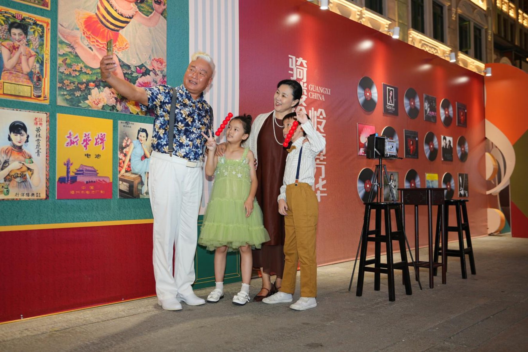 现场还专门设置了骑楼廊影打卡点和岁月叙事廊打卡点,复古留声机、自行车、行李箱,以及满墙黑胶唱片,吸引了一批批游客拍照打卡。