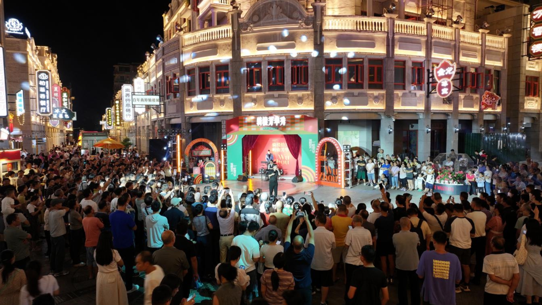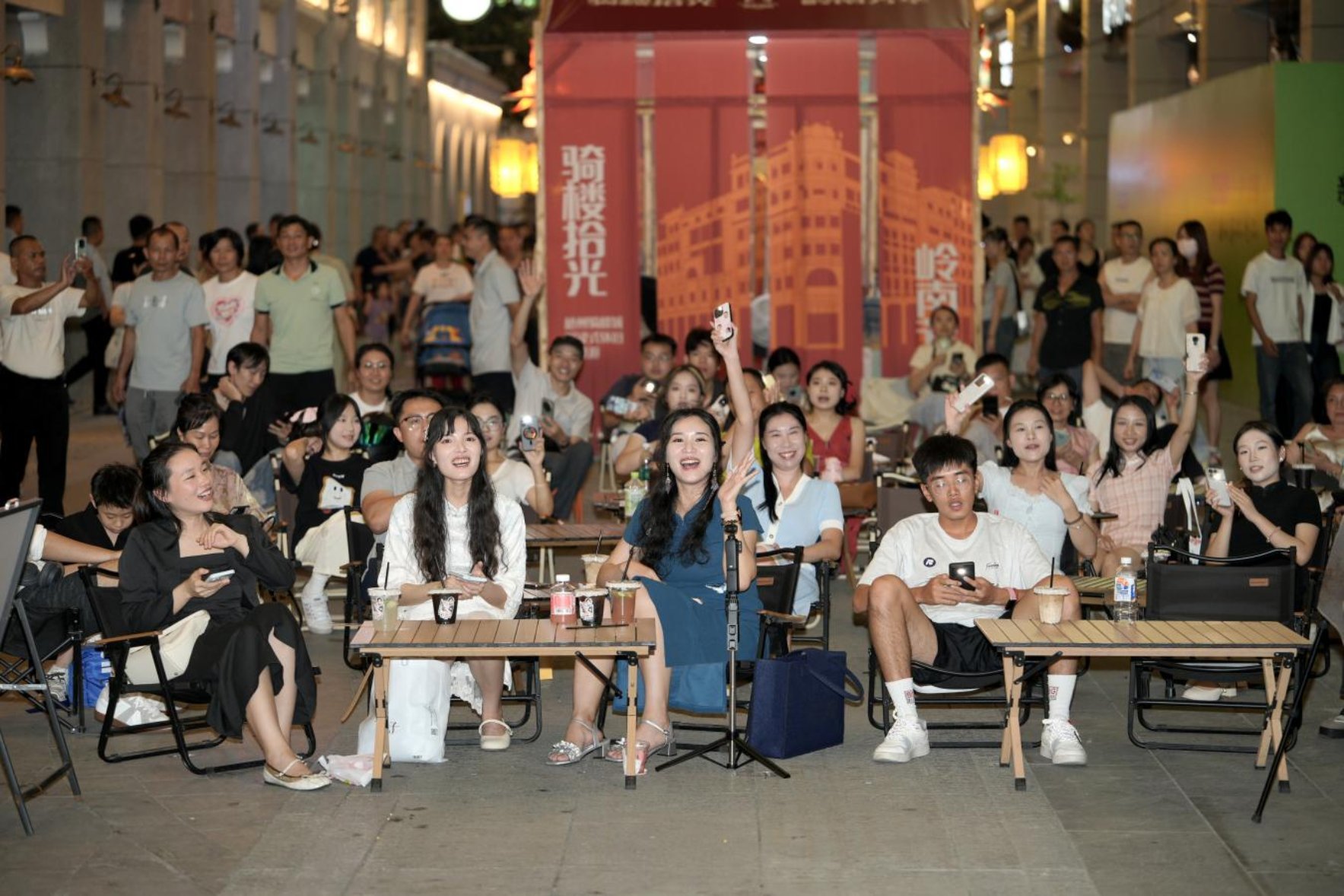 再往前走,街头演艺《骑楼琴缘》正在廊檐下浪漫上演,萨克斯流淌出悠扬旋律,小提琴随即应和着响起清亮音色,乐器合鸣萦绕骑楼廊柱,为百年建筑注入优雅律动。与此同时,骑楼芳华秀以十字街中心广场为舞台,经典粤语金曲《漫步人生路》《万水千山总是情》等接连唱响,舞台歌手与二楼窗台歌手相互呼应、放声歌唱,实现“空中舞台”与“地面观众”的立体互动。
