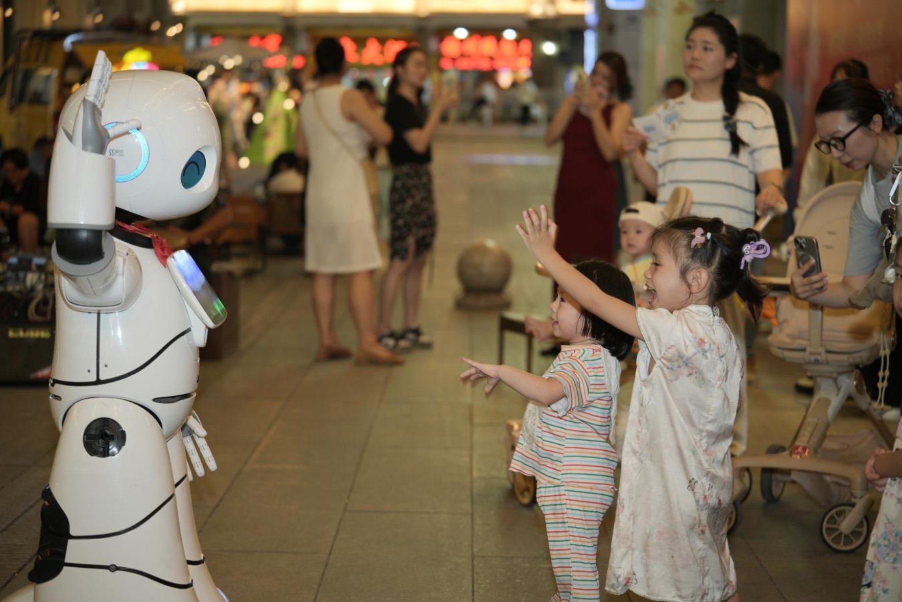 活动现场还惊喜出现AI机器人,为怀旧主题增添了现代科技感。一个未来感十足的机器人从右侧走廊灵动走出,随着合唱节奏翩然起舞,其机械舞姿与经典音乐形成奇妙碰撞。互动环节更成为全场焦点,孩子们纷纷围拢上前,有的摆出同款舞蹈姿势,有的伸手与机器人“击掌”,更有的兴奋地与机器人“比心”互动合影,让科技体验更具温度。