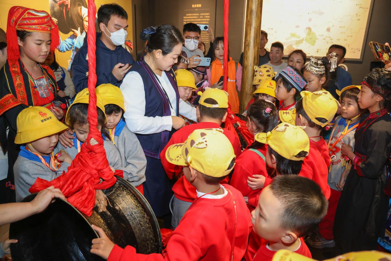 欣赏动听的民乐后,“小东北虎”们跟随博物馆讲解员月亮姐姐参观了“穿越时空的鼓声——铜鼓文化展”。在边看边学中,萌娃们不仅了解了广西铜鼓文化的起源,知道了铜鼓的演变过程,观察和辨识了各种各样的铜鼓纹饰,还聆听了铜鼓浑厚的声响。