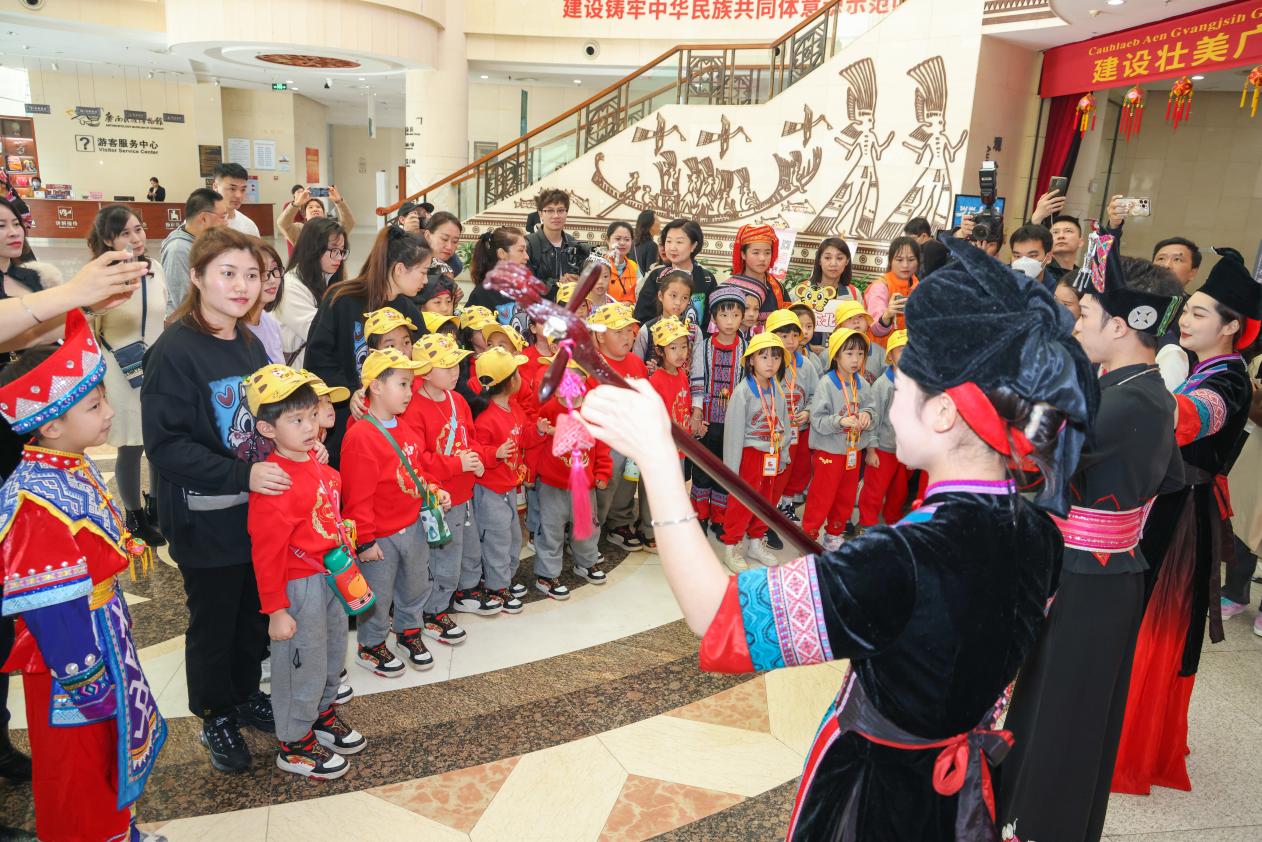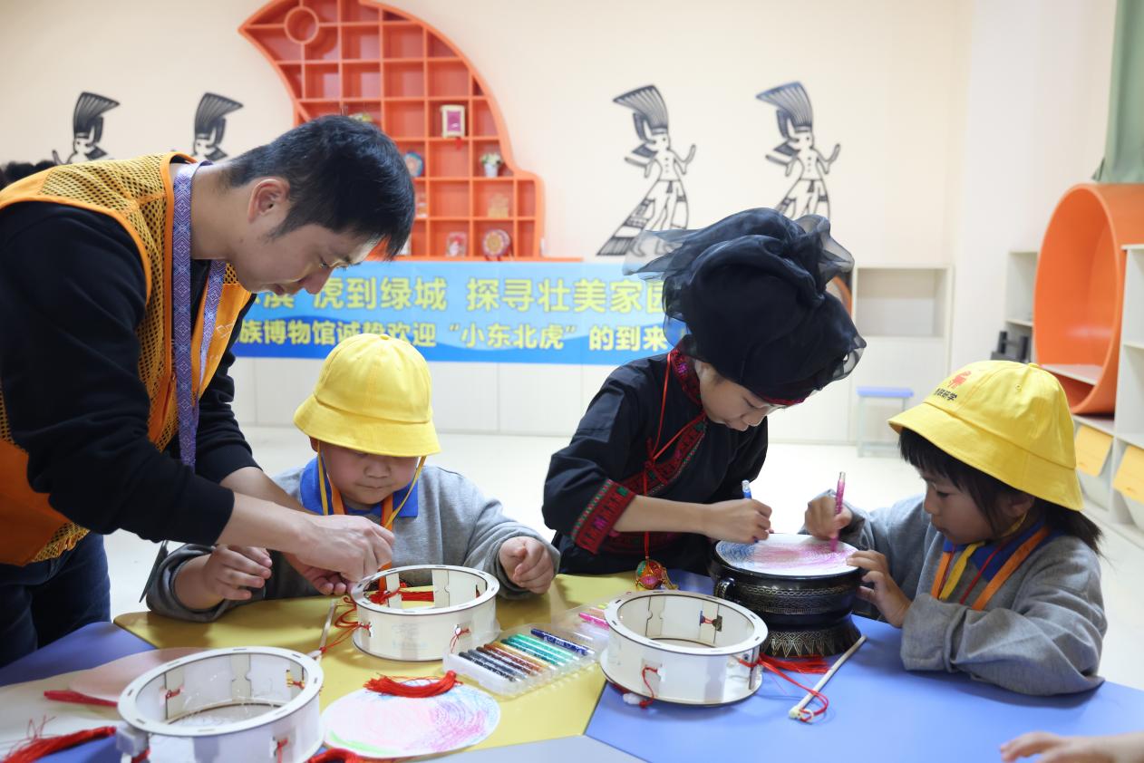此次研学活动以广西独特的铜鼓文化为主要内容,通过天琴弹唱非遗展演、展厅研学导览、铜鼓拓印体验、铜鼓花灯制作体验等互动形式,向“小东北虎”们展示了多元的广西民族文化,种下“民族团结”的种子,铸牢中华民族共同体意识。