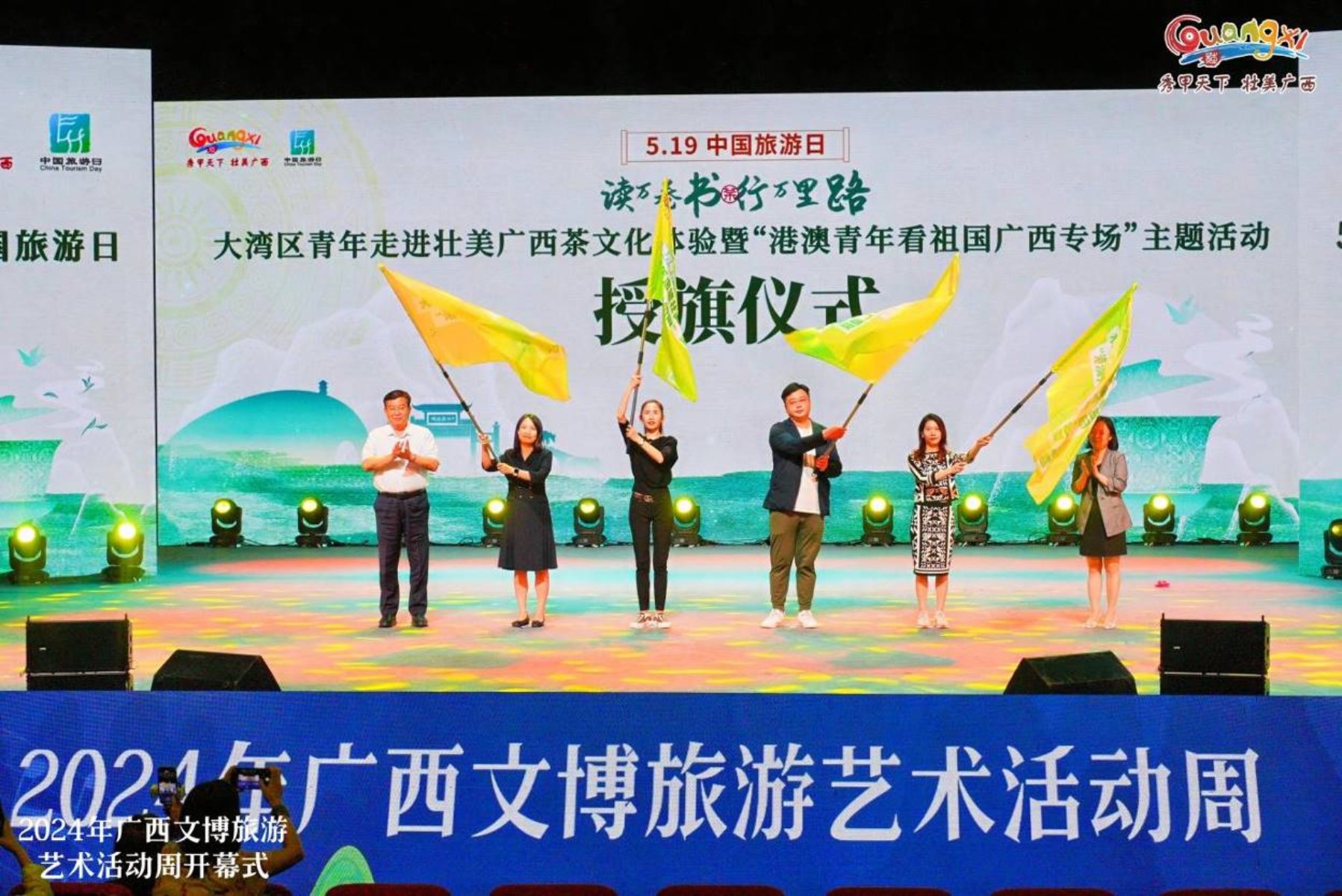 甘霖、左向蕾为参加“读万卷书 行万里路——大湾区青年走进壮美广西茶文化体验”暨“港澳青年看祖国广西专场”主题活动的桂粤港澳四地青年代表授旗