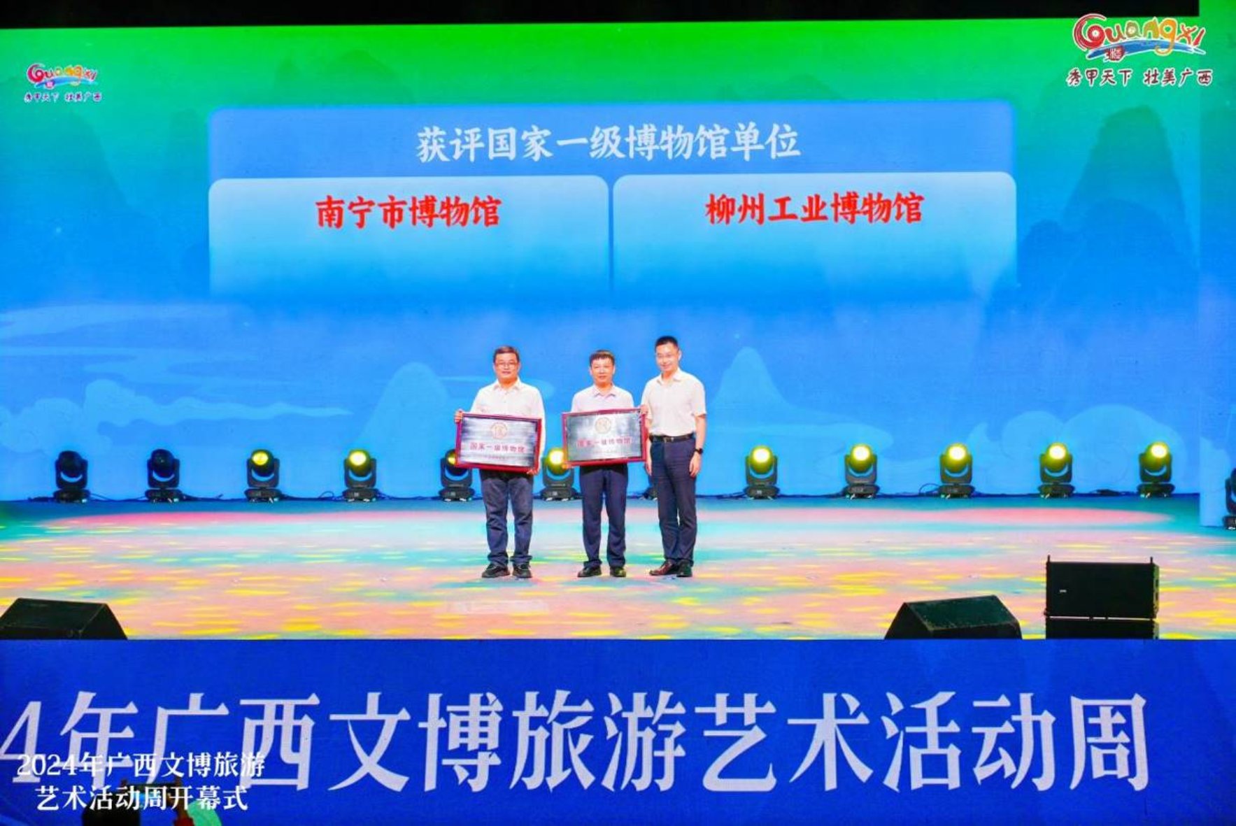 开幕式上,自治区党委宣传部副部长、文化和旅游厅党组书记甘霖,共青团广西区委副书记、广西青联副主席左向蕾为参加“读万卷书 行万里路——大湾区青年走进壮美广西茶文化体验”暨“港澳青年看祖国广西专场”主题活动的桂粤港澳四地青年代表授旗。自治区党委宣传部副部长韩流为南宁市博物馆、柳州工业博物馆两家获评第五批国家一级博物馆的单位授牌。自治区文化和旅游厅党组成员、副厅长,自治区文物局局长谢日万为全区博物馆“十佳”代表性教育项目和2023年度广西革命文物保护利用优秀案例的获奖单位颁发奖项。