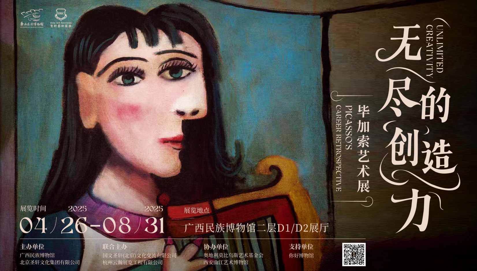 4月26日,“无尽的创造力——毕加索艺术展”在广西民族博物馆开幕。作为20世纪最具影响力之一的艺术大师,毕加索以革命性的艺术语言彻底改变了现代艺术的发展轨迹。本次展览由广西民族博物馆与北京圣轩文化集团联合主办,展出139件毕加索不同创作阶段、各类媒介的作品,包含3幅珍贵油画、4幅典藏硬笔画、100+经典版画,以及1套23件毕加索亲自设计定制的银盘和10件亲制陶器等,多方位展现这位艺术巨匠的非凡创造力。