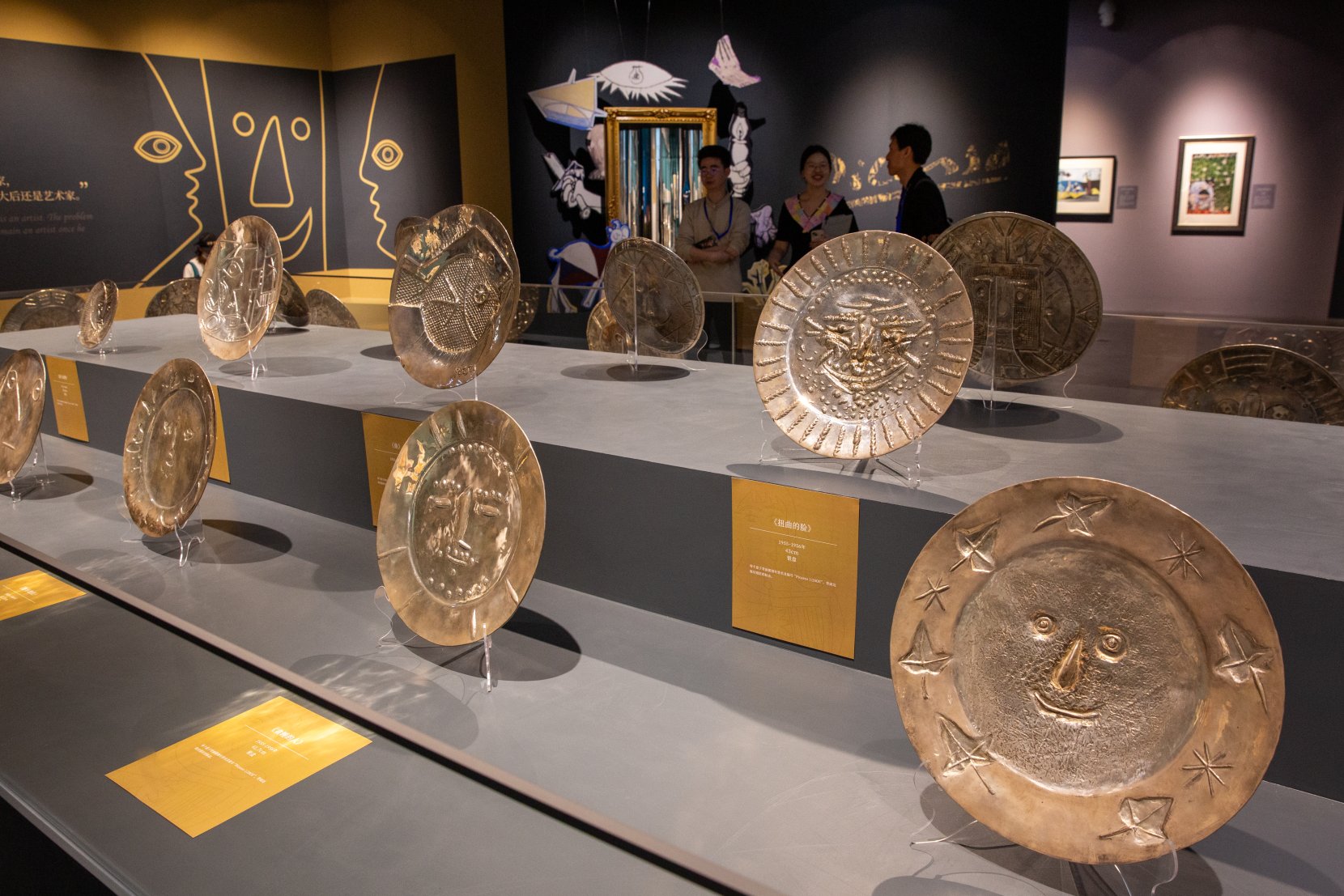 “灵感实验—器物”单元展示了毕加索在陶瓷艺术领域和银盘创作领域的突破性探索。在法国瓦洛里小镇,毕加索受到地中海风情的启发,创作了633件陶艺作品,包括餐盘、花瓶等日常生活器物。他将解构主义与彩塑、绘画、拼贴等技法相结合,赋予传统陶瓷艺术全新的生命力。斗牛士、自然景致、女性形象等主题跃然“陶”上,色彩斑斓,形态鲜活。而毕加索的银盘存世量极少,多由私人或博物馆珍藏。据悉,目前全世界能凑够全套24件的仅有2至3套。通过这一单元,观众可以感受到毕加索如何将艺术融入生活,并在平凡中创造非凡。