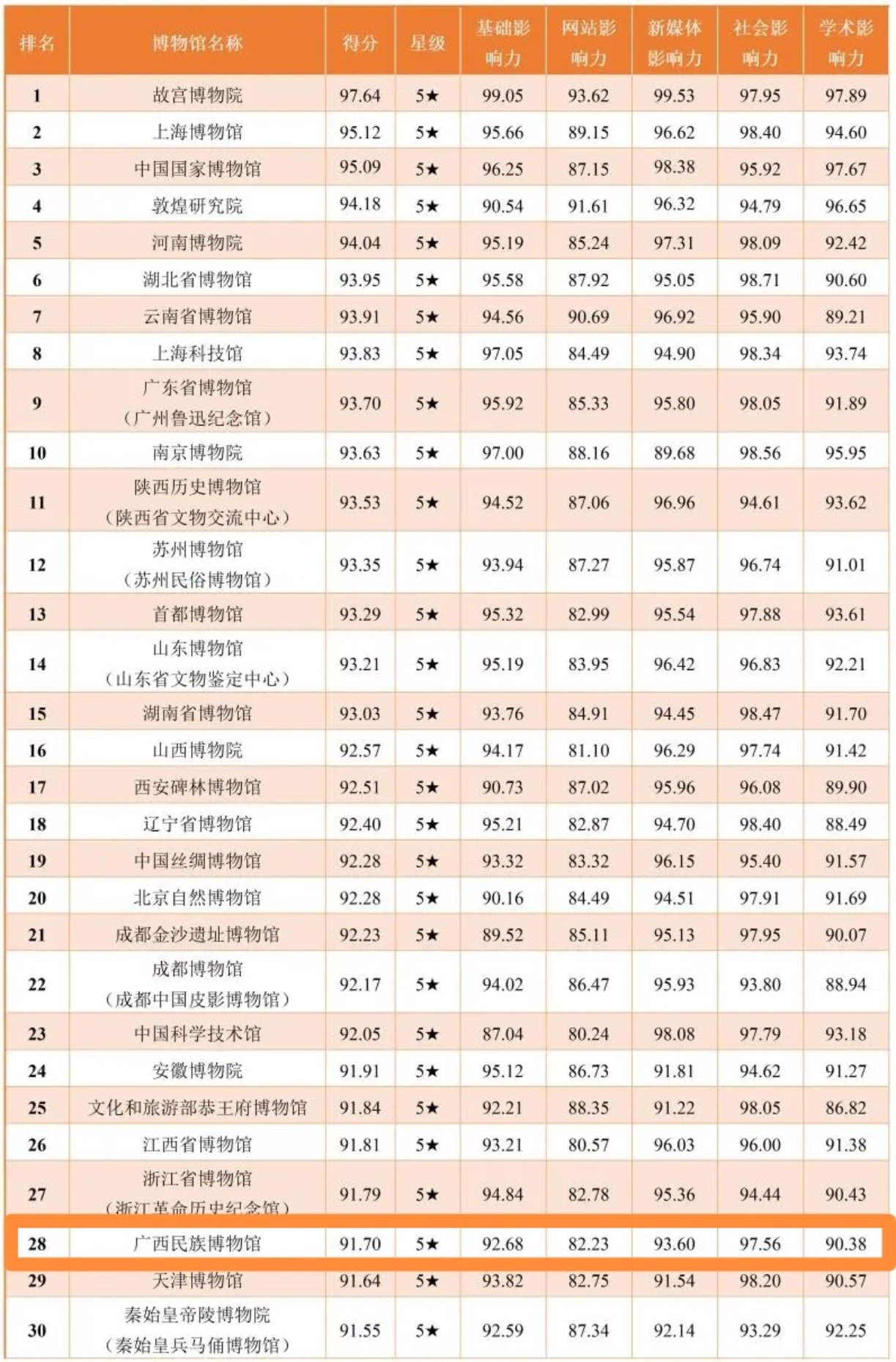 在“中国博物馆网络影响力指数总榜”中,广西民族博物馆位列二十八。