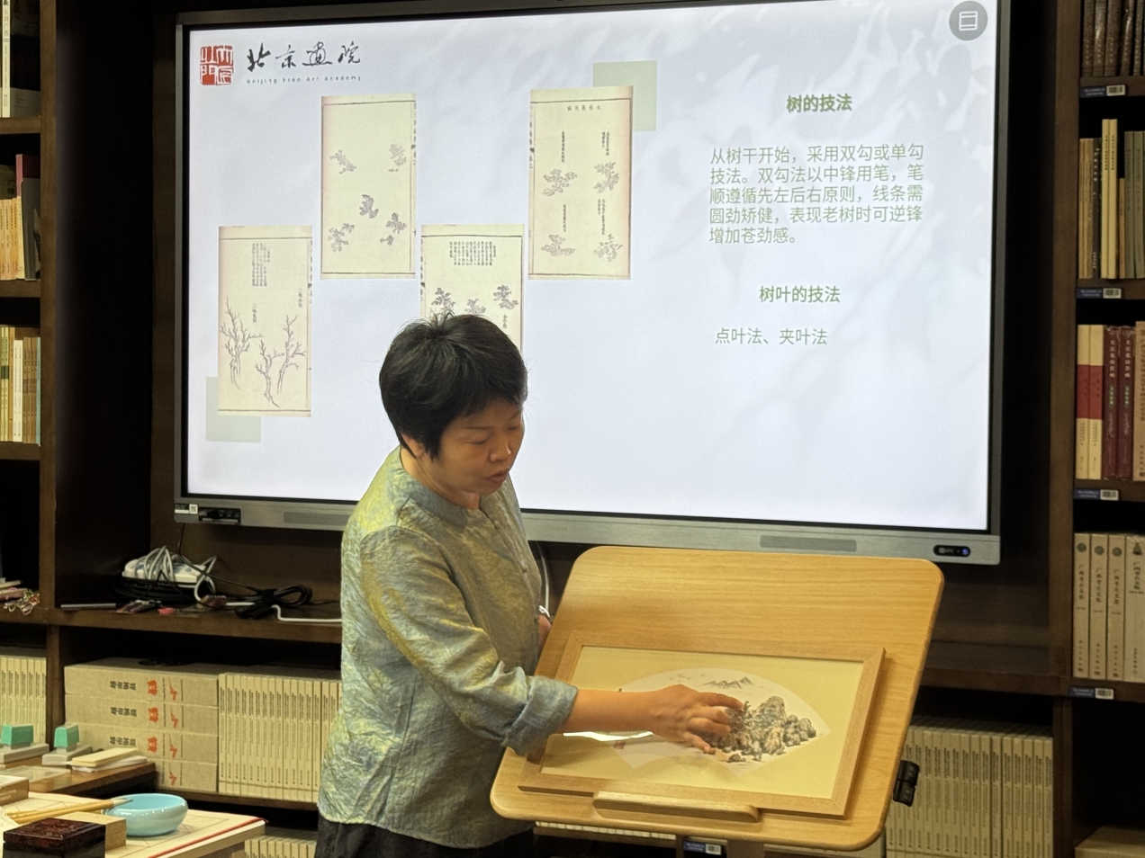在9月20日上午的“丹青映染 碧溪漱玉”——中国历代山水扇面艺术讲座与创作体验活动现场,张蕾老师以“咫尺乾坤——馆藏明清山水画扇面展”中展出的扇面为“钥匙”,生动勾勒出山水画从魏晋萌芽时的青涩、唐宋成熟时的恢宏,到明清繁荣时的精巧的发展历程,让参加活动的青少年和家长们仿佛穿越千年艺术长河。随后,张老师从起笔落墨到着色晕染,耐心指导每一位参与的观众进行作画。当空白的扇面在笔下渐渐绽放出水墨山水的轮廓,大家直呼“亲手画出传统山水的感觉真是太奇妙了”。