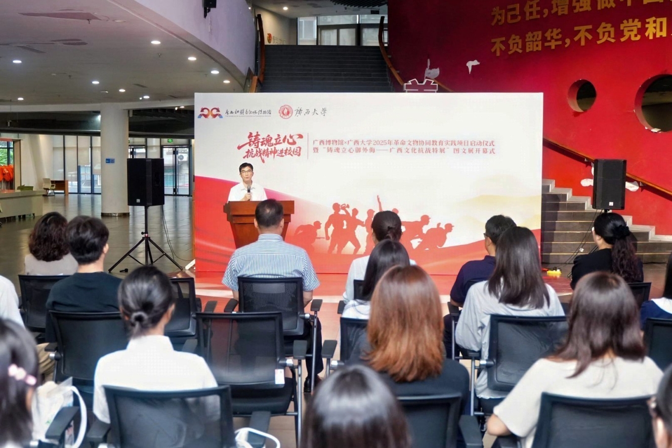 9月25日上午,“铸魂立心·抗战精神进校园”——广西博物馆×广西大学革命文物协同教育实践项目启动仪式在广西大学大学生活动中心举行。该项目依托“铸魂立心御外侮——广西文化抗战特展”,在纪念中国人民抗日战争暨世界反法西斯战争胜利80周年的背景下,推动革命文物资源融入高校思政教育。