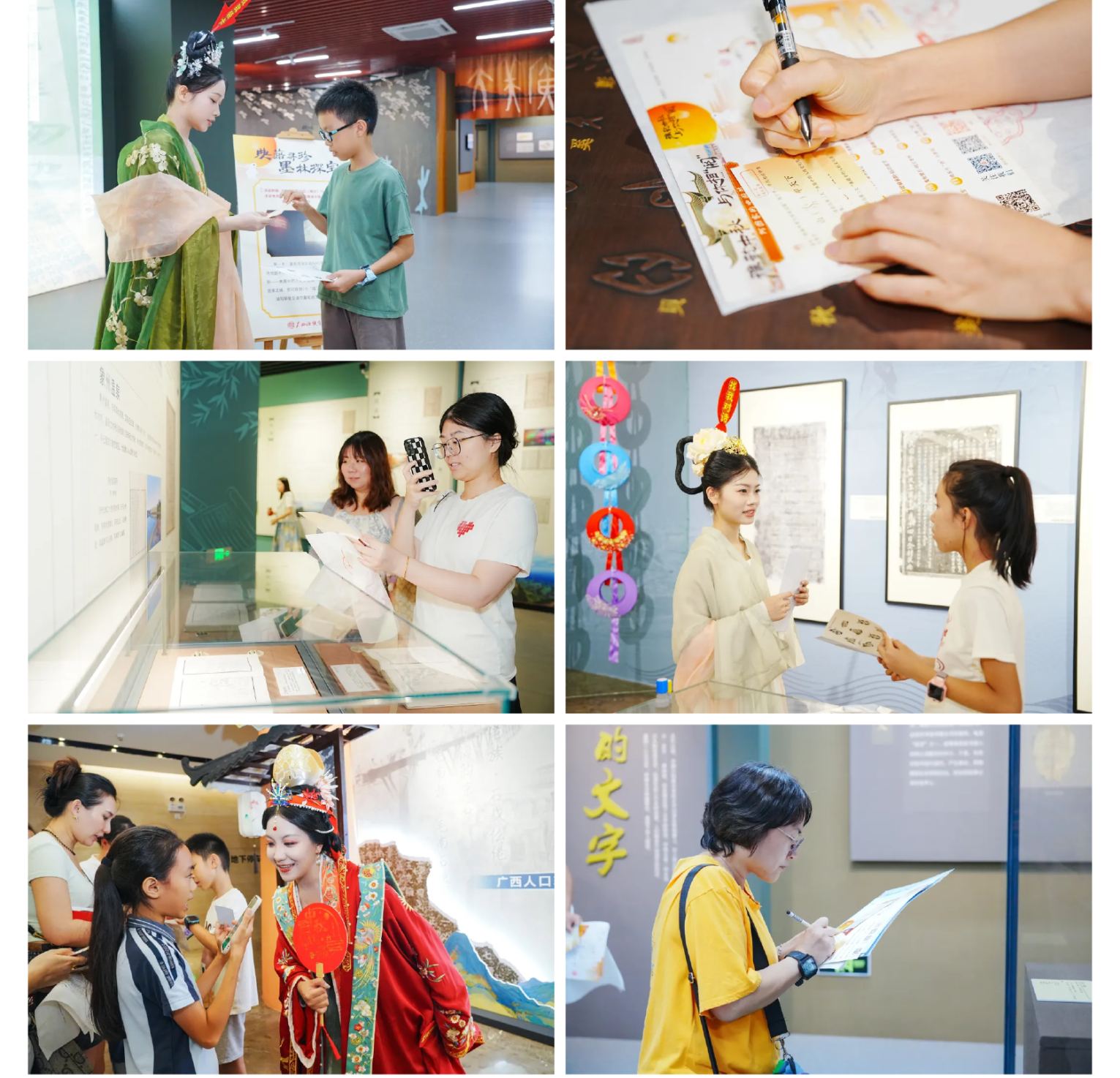 典籍寻珍,墨林探宝。游园会特别策划的展厅寻宝环节,巧妙地将广西图书馆殷墟甲骨与居延汉简、典籍中的八桂文化展、广西人口较少民族拓片展3大常设展览串联。读者手持寻宝题卡,通过参与解锁识读甲骨文、寻找并背诵广西古诗词等任务,穿越时空,与历史对话,感受八桂千年文脉的深邃与厚重。