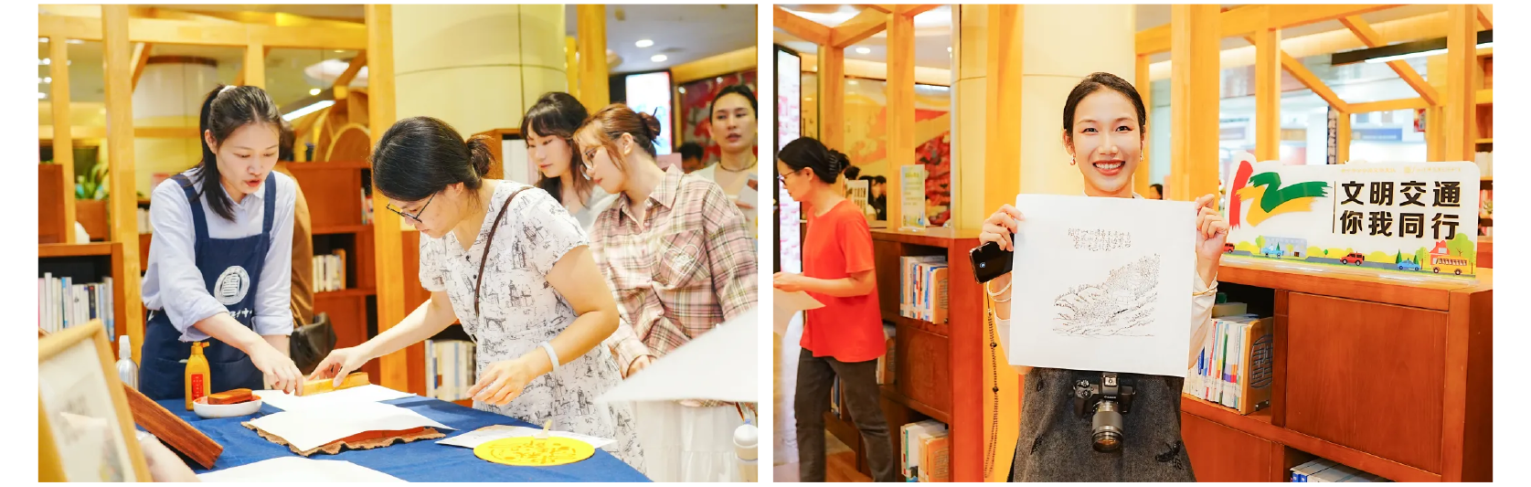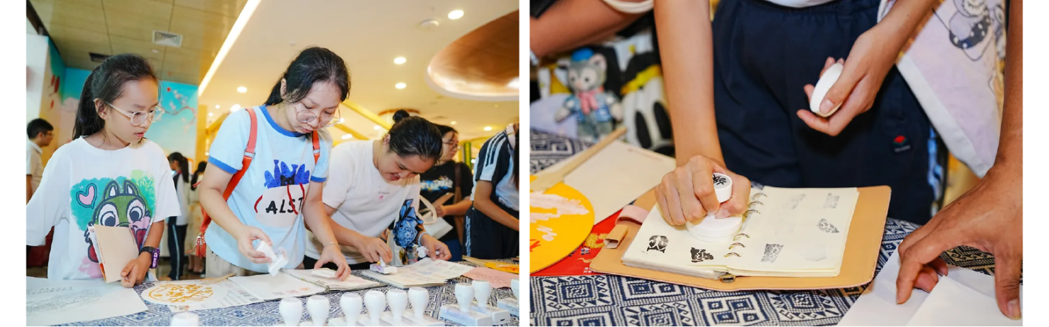 古版新韵,墨印流芳。传统文化体验区,非遗拓印团扇、雕版印刷体验大排长队。在老师的指导下,读者或亲手拓印“嫦娥奔月”“花好月圆”,或刷印“探青山”“好运连连”,当纸张轻轻揭起,清晰图案跃然眼前,墨香与纸韵交织,绘就一幅幅独具韵味的中秋佳作。一旁的特色印章集章区同样人气高涨,广西图书馆原创的“吉祥话”“劝学诗”“百鸟衣”及“甲骨文十二生肖”系列印章首次集体亮相,以方寸之雅,为中秋游园留下一份隽永的文化纪念。