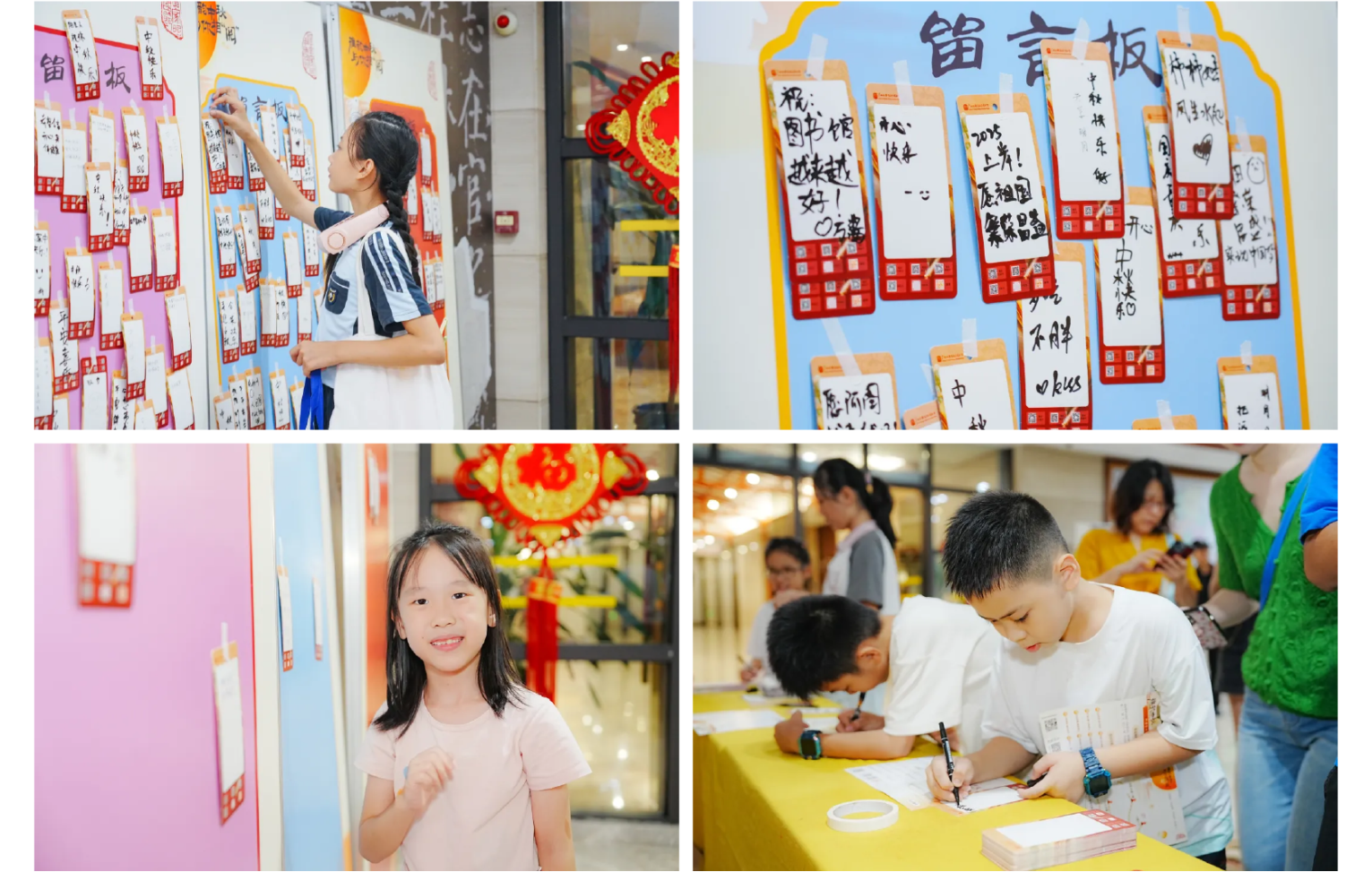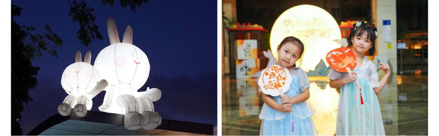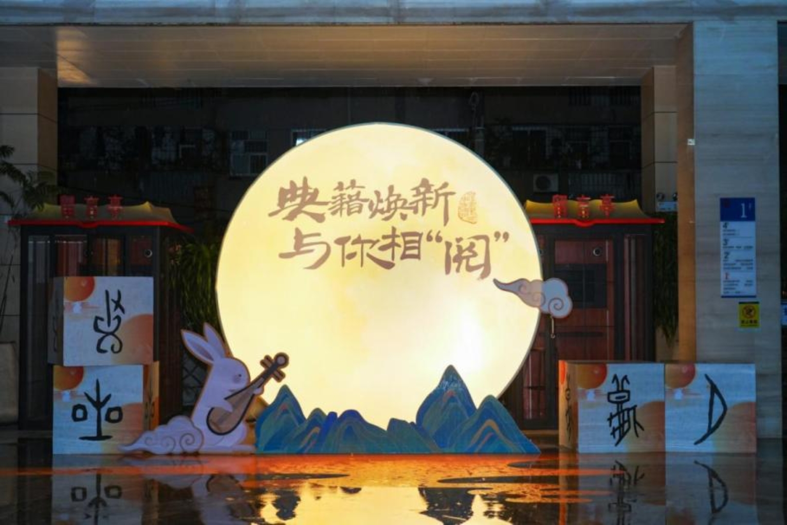 中秋雅韵,明月寄怀。游园会特别设置“阿图家的书签”互动墙,读者将写满祝福与心愿的书签轻轻贴上,共同筑起一面温暖而浪漫的留言之墙。馆内多处主题打卡装置亦悄然成景:馆舍门顶,“兔保安”俏皮上岗;树梢枝头,诗词灯条低吟浅唱;巨型“四时读书乐”经折装静立一侧,娓娓道来书香传承;更有巨型传统灯笼伫立,圆满诠释中秋的雅致与团圆意蕴,为游园之旅定格诗意瞬间。