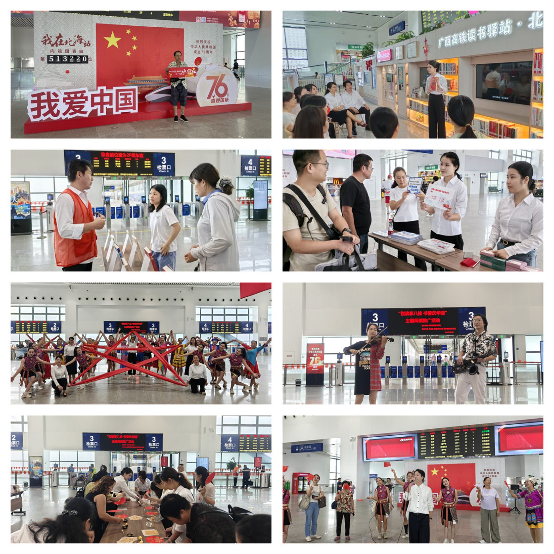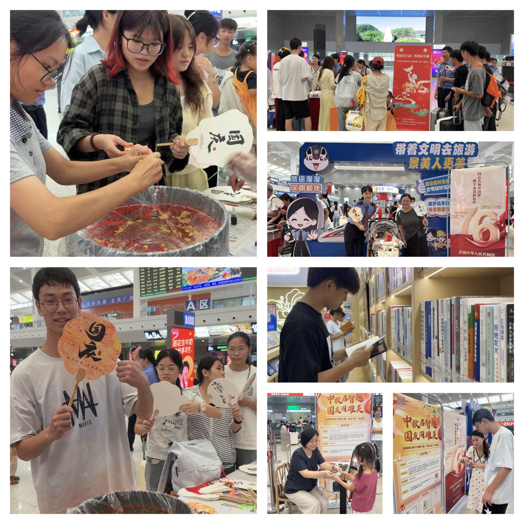 北海站通过“八桂文化快问快答”“强国知多少”问答环节、“爱国主题拓印”团扇制作和红色主题表演等,形成充满家国情怀与文化底蕴的旅途体验;“抗战主题图书展”精选爱国主题读物与八桂文化典籍,更增添浓厚的文化气息。防城港北站以丰富多样的形式点燃旅客的爱国热情,通过“爱国主义主题图书展”、16枚地方文旅印章收集、爱国主义诗歌朗诵和留言活动营造浓厚氛围;当《我和我的祖国》旋律响起,旅客齐声合唱将活动推向高潮。贵港站重点推介《让历史照亮明天》等精选党史书籍,党员干部、学生和旅客共同朗诵国庆主题诗歌;“诗词飞花令”围绕“家、国”等关键词展开,国庆主题灯笼制作和《歌唱祖国》红歌快闪增强爱国氛围。贺州站为少年儿童策划“盛世中华”“东方巨龙”“强国少年”“大国成就”“共庆华诞”等活动环节,激发爱国情怀、培养民族文化认同感。崇左南站精心布置革命历史、英雄传记等优质电子书展,实现“即扫即读”;“国庆知识有奖竞答”和“阅读感悟分享墙”让旅客重温国家发展历程、书写对祖国的祝福。