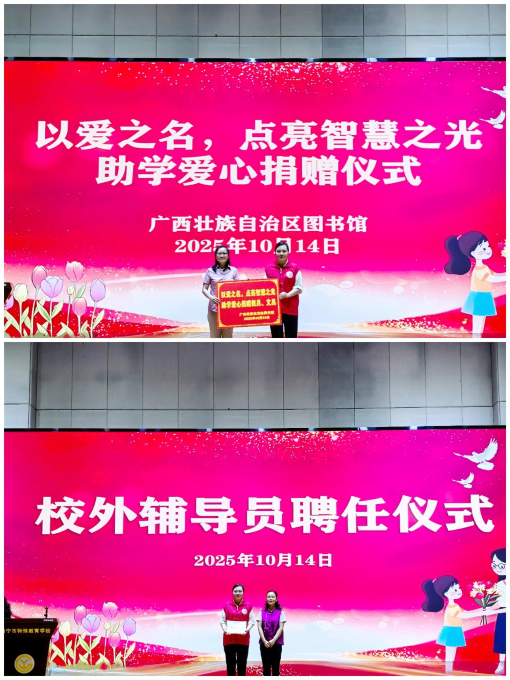 活动伊始,广西图书馆向南宁市特殊教育学校捐赠了一批教具与文具,以实际行动支持特殊教育事业发展。随后,学校举行校外辅导员聘任仪式,聘请广西图书馆馆员担任校外辅导员。校方代表在致辞中表示,图书馆作为“知识的宝库”,将为学生们提供更专业的阅读指导和文化活动,助力特殊儿童成长。
