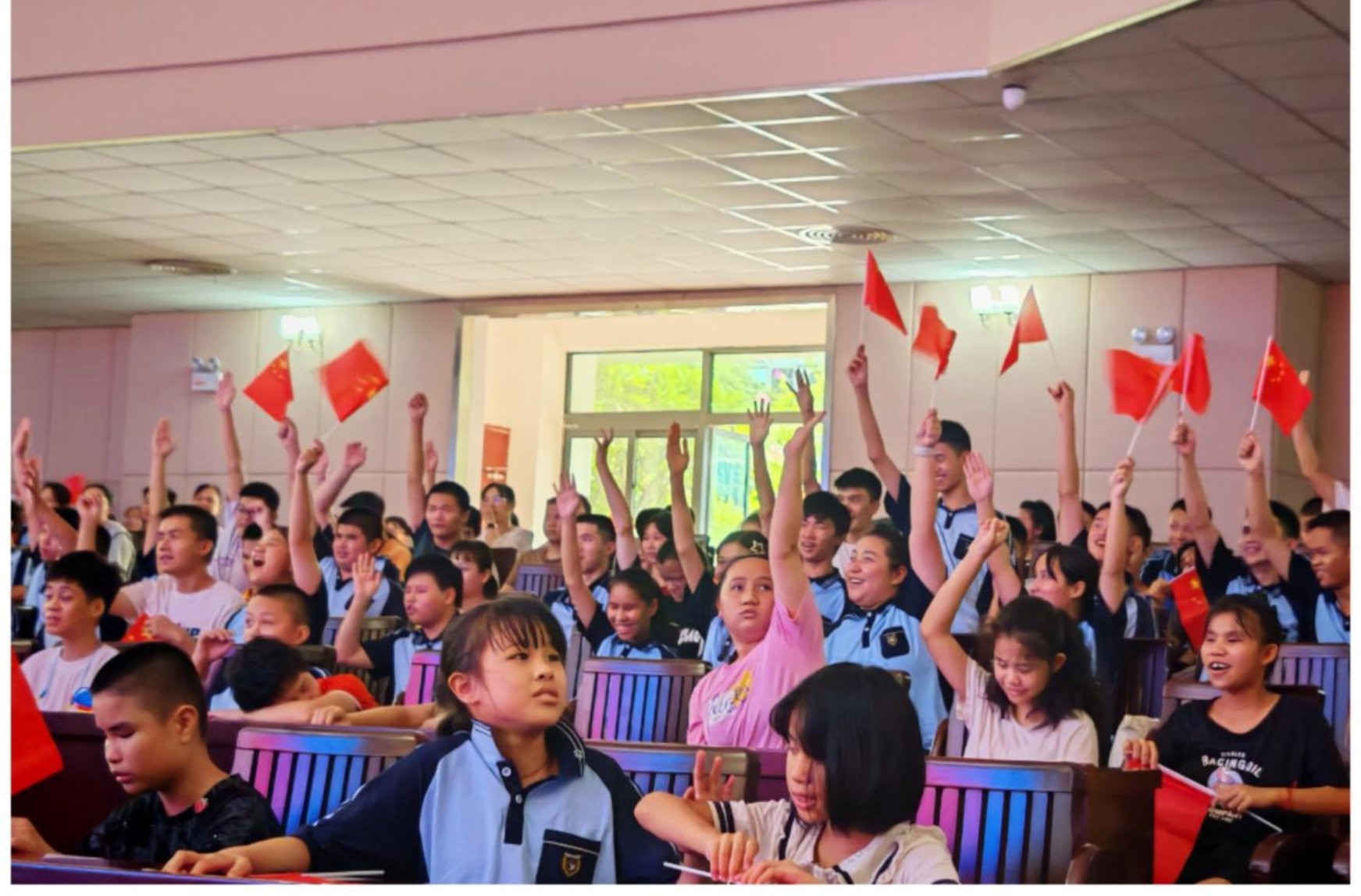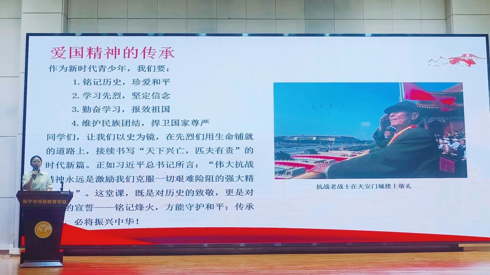 思政课堂以“循迹抗战征程”为主题,通过四个单元生动还原历史:第一单元“勇毅燃星火”,以诗歌朗诵《在冬天的麦苗上,看到中国的春天》展现民族觉醒;第二单元“血肉筑长城”,通过京剧《湘江故事》选段《珍贵的发电机》演绎革命先辈的牺牲精神;第三单元“寰宇共凯歌”,通过红歌竞猜与抗战知识问答,深化学生对历史的认知;第四单元“吾辈自强”,广西图书馆馆员和南宁市特殊教育学校师生合唱《如愿》,传递新时代青年的使命担当。