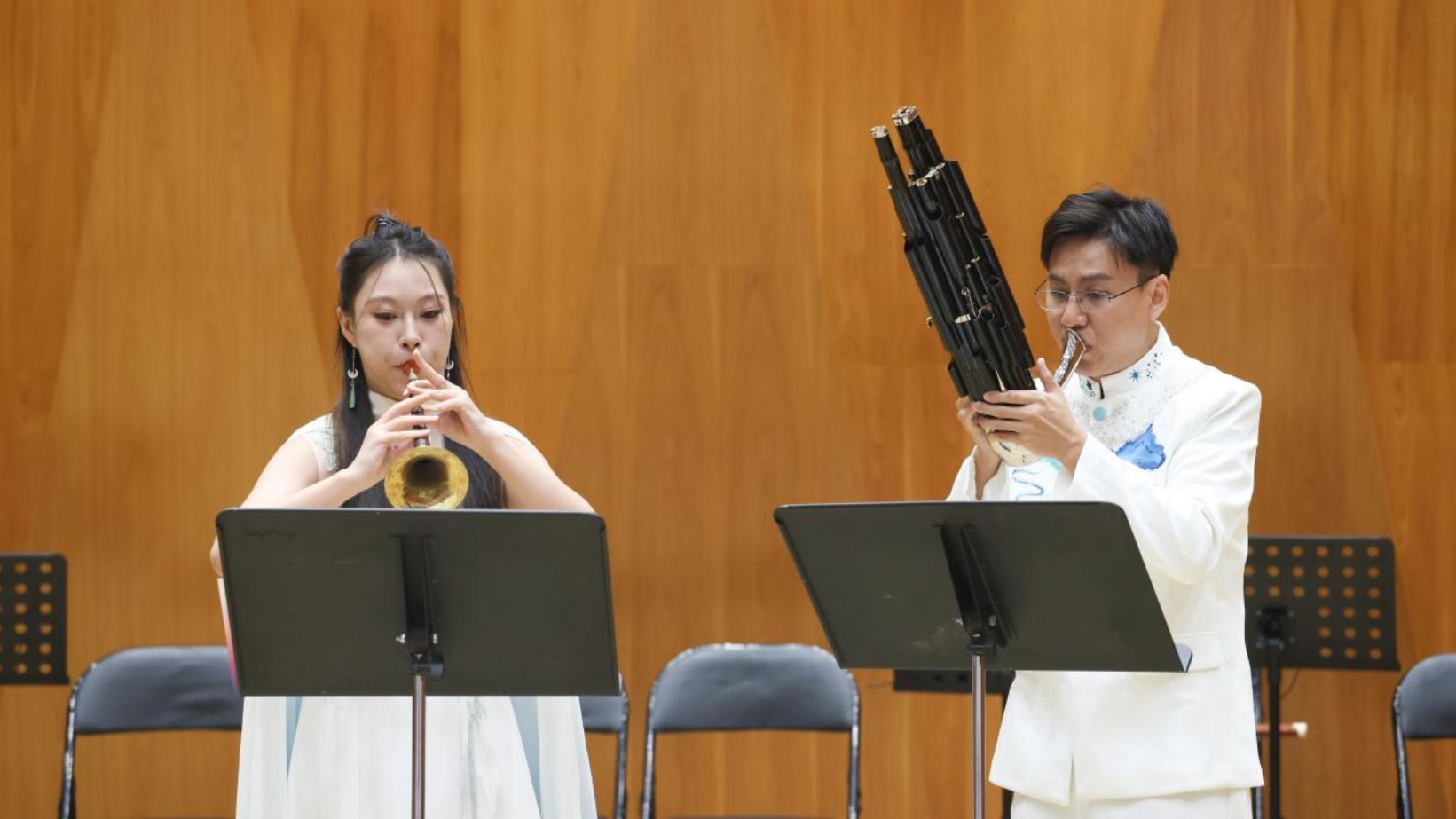 学员张洳和熊昊以唢呐和笙吹奏毛南戏《唢呐曲》