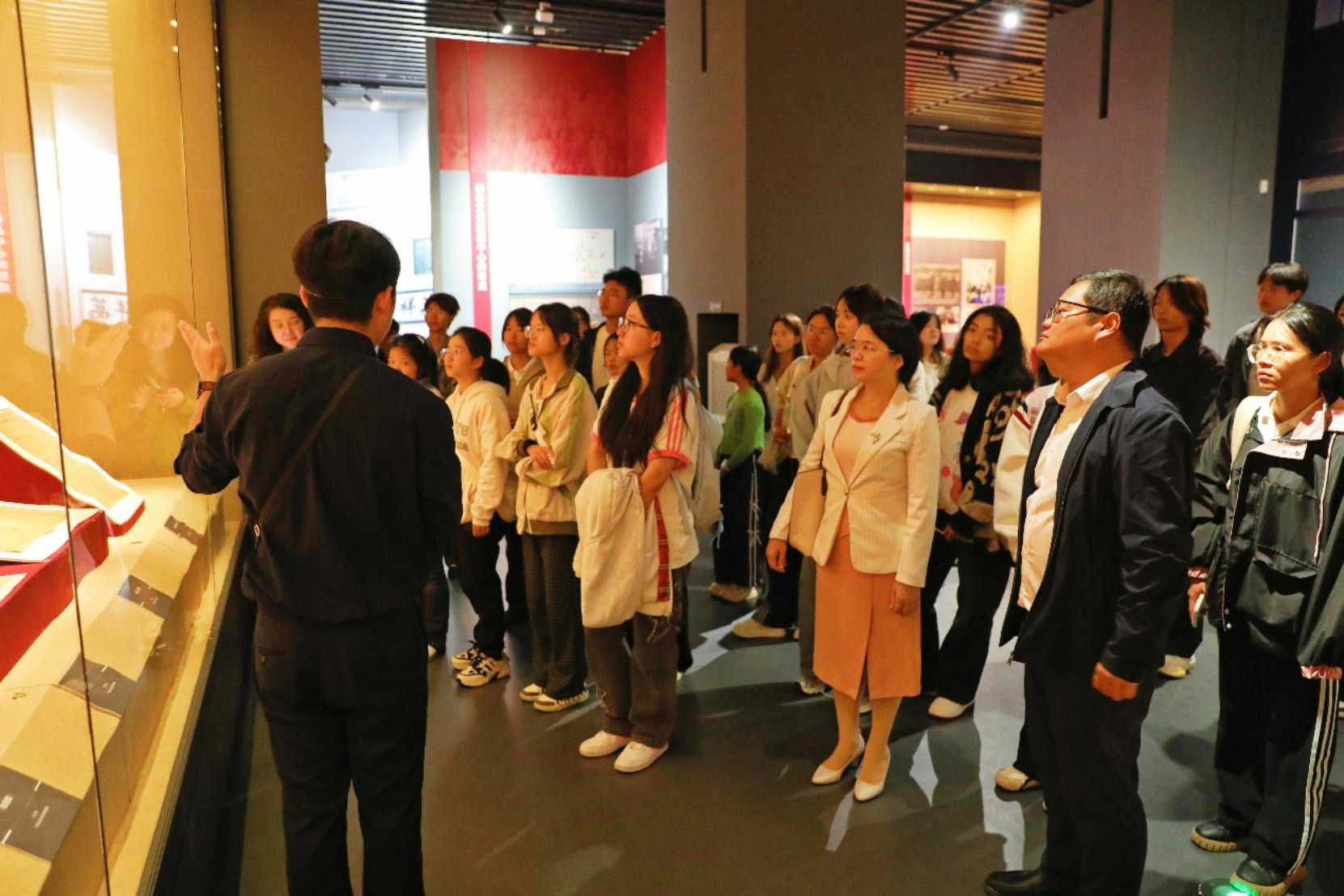 揭牌后,广西博物馆讲解员与广西经贸职业技术学院学生代表分别作了《一颗红心永向党》《铁打的一群:在战火中闪耀的青春》主题宣讲;广西经贸职业技术学院师生共同参观了“铸魂立心御外侮——广西文化抗战特展”,充分利用优质革命文物资源开展“大思政课”实践教学。
