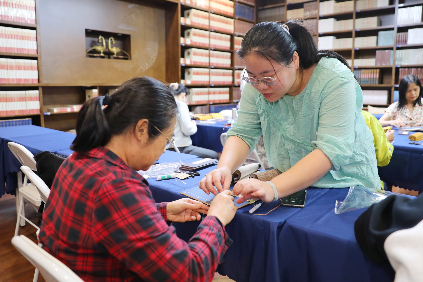 广西博物馆古籍修复师杜宇指导参加活动的人员缝制“线装书”